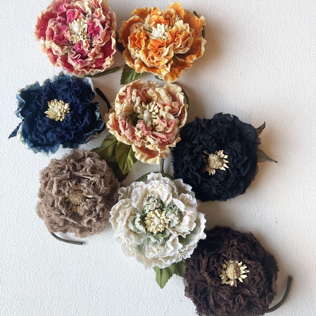 アトリエ染花が長きにわたり作り続けてきた定番アイテムに、新色が加わりました。今までになかった大人っぽい色合いが魅力です。 写真2枚目より順に、サーモン、亜麻色、ピンクグレー、鉄紺 素材:綿、キュプラ、レーヨン 金具:コサージュピン サイズ:6.5×7cm ※商品写真は出来るだけ実物の色に近くなるよう努めておりますが、撮影環境、お使いのブラウザ等環境により見え方が若干異なる場合がございます。予めご了承ください。