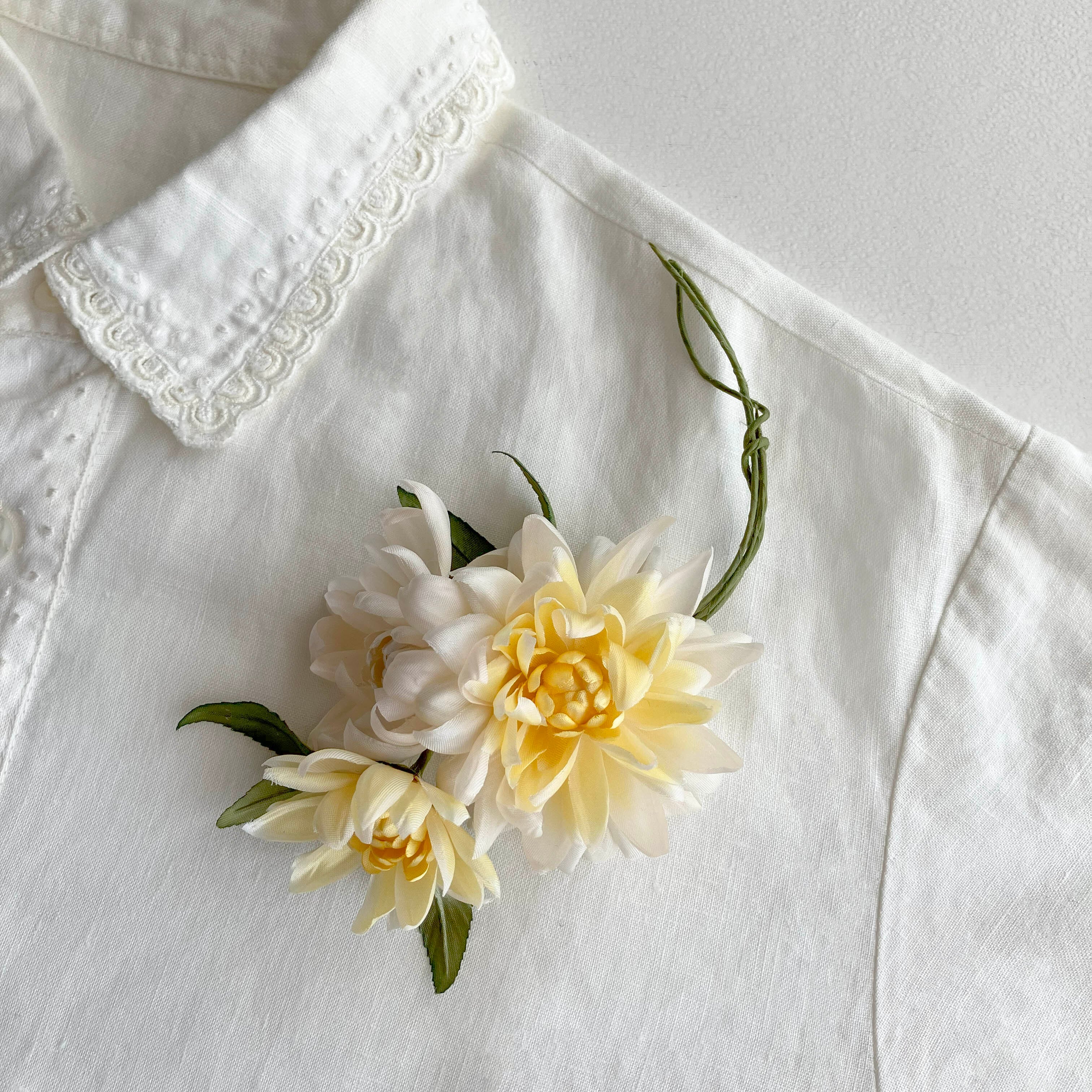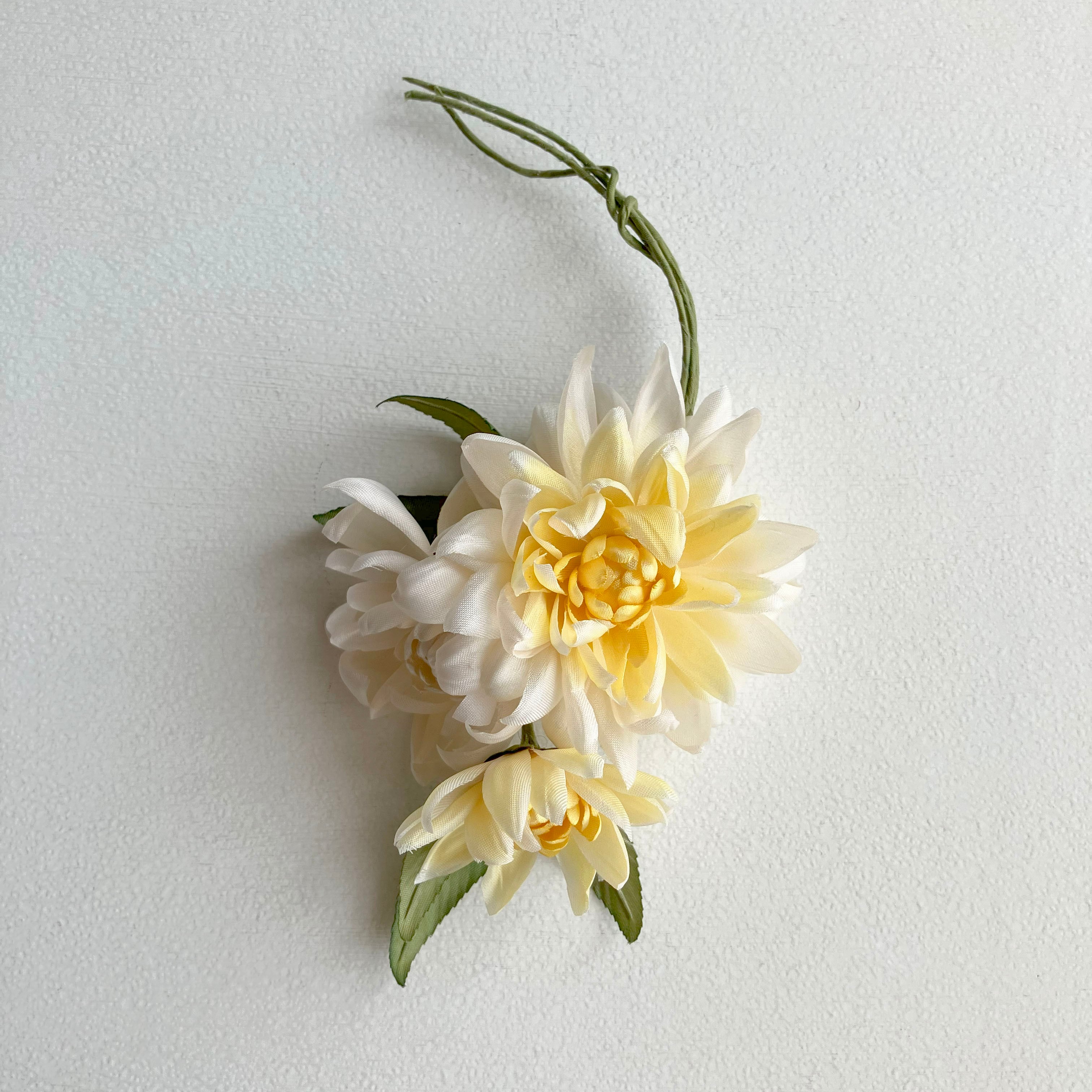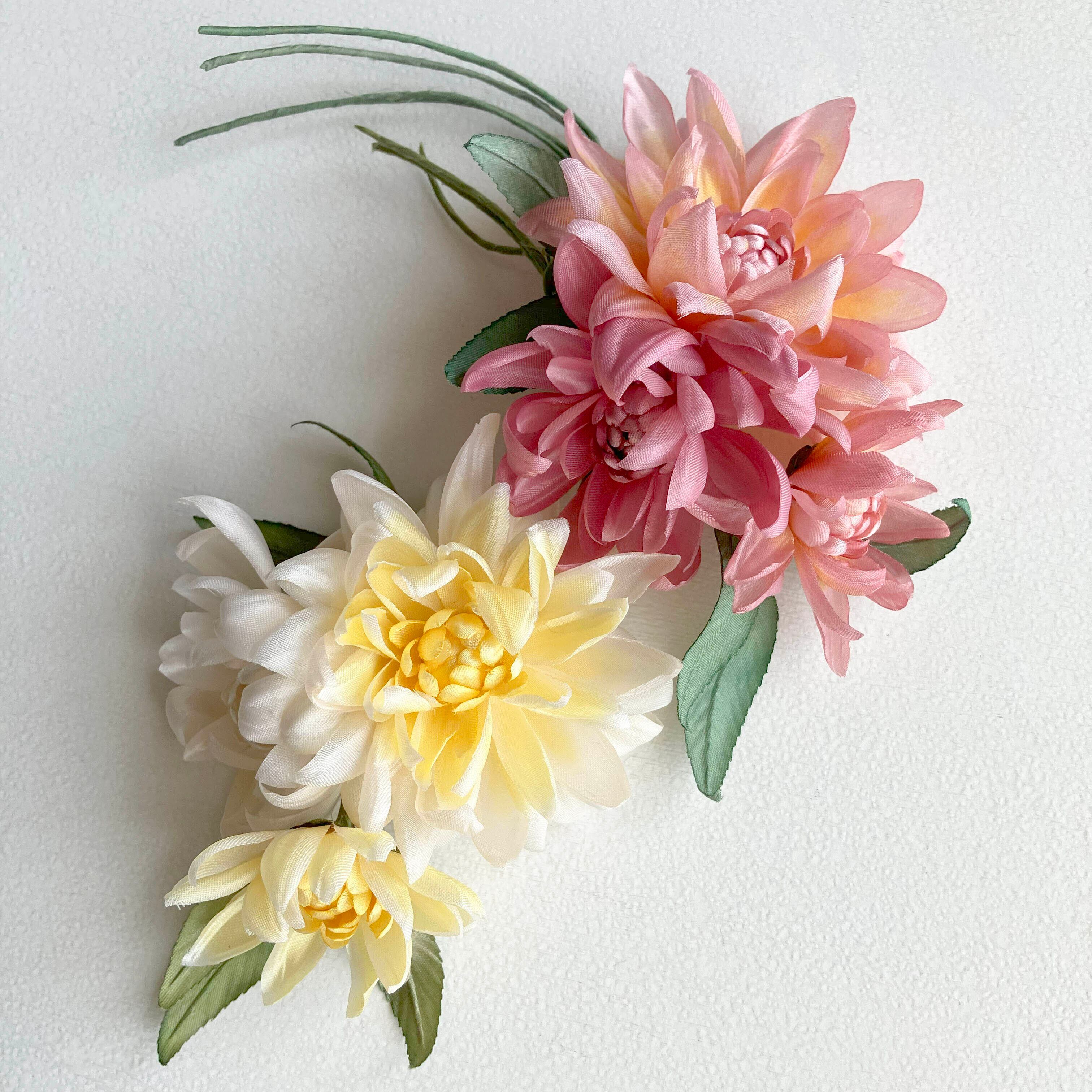 大・中・小の3輪を束ねて作るダリアのコサージュキット。澄んだきれいな色に染まった花びらには、一枚一枚に深みの増すこだわりのぼかし染めを施しています。軽やかな素材感を活かしたコテあてにより花びらにやわらかな動きをつけることで、立体感のある優雅で華やかなダリアのコサージュが完成します。ピンクとイエローの二色展開です。