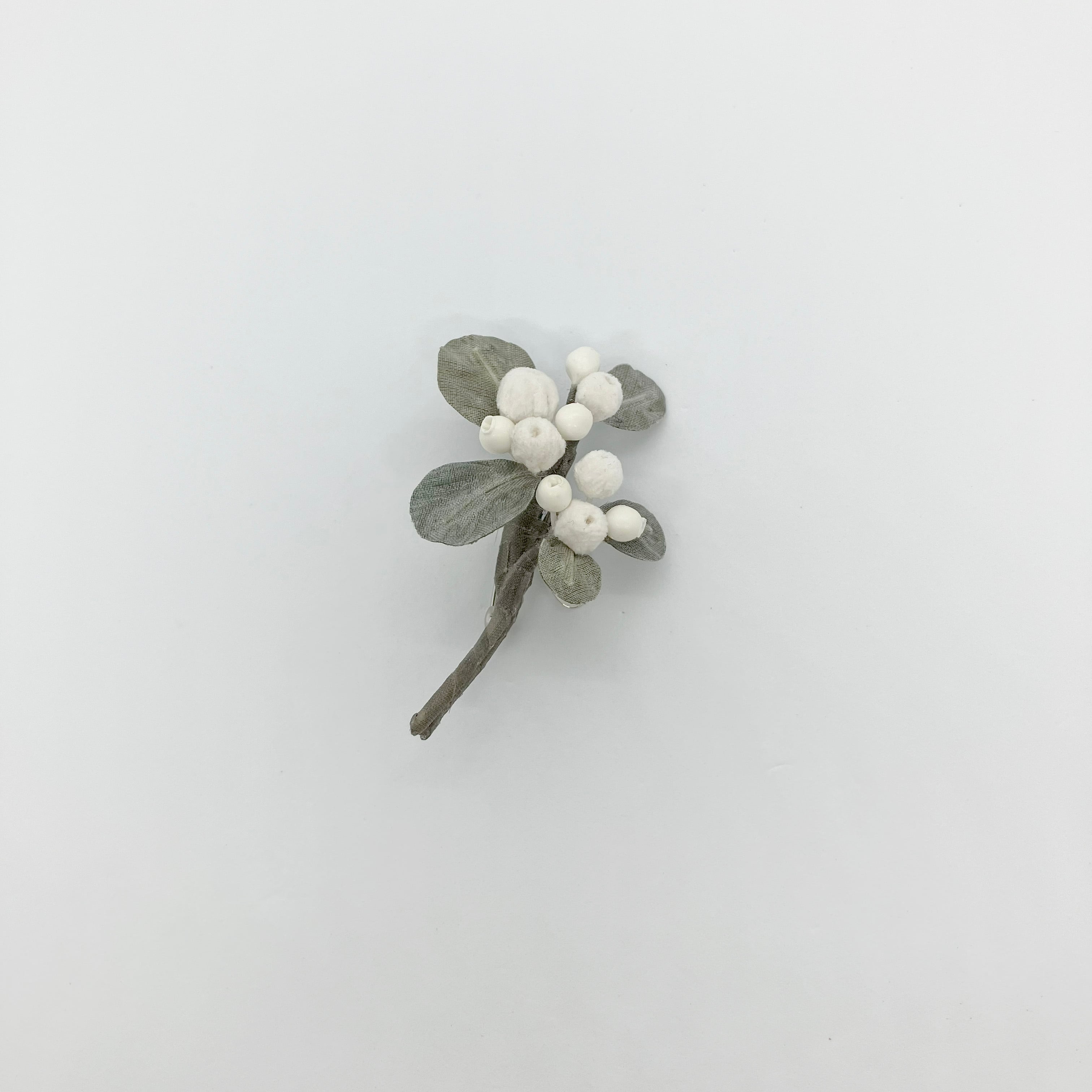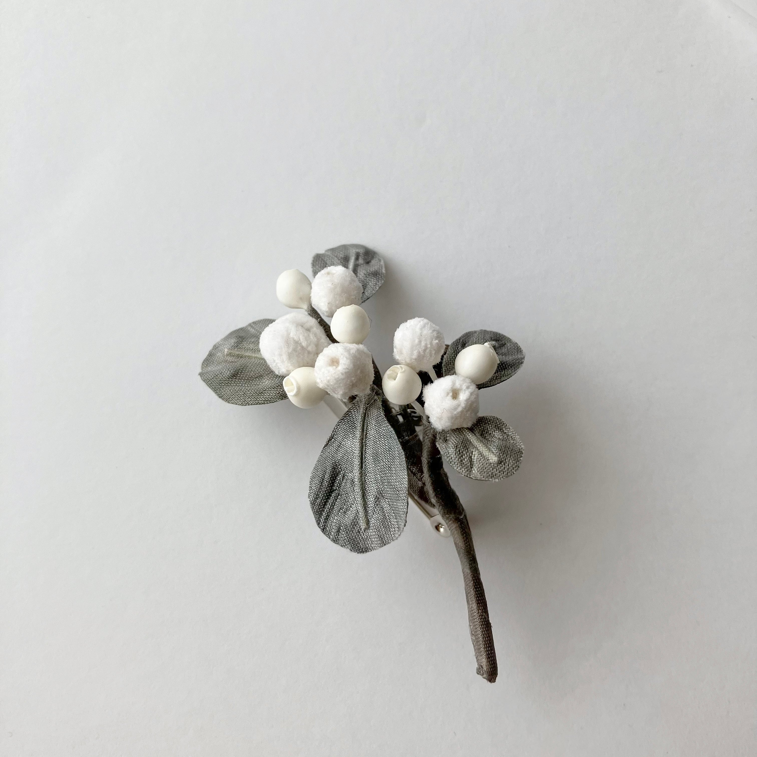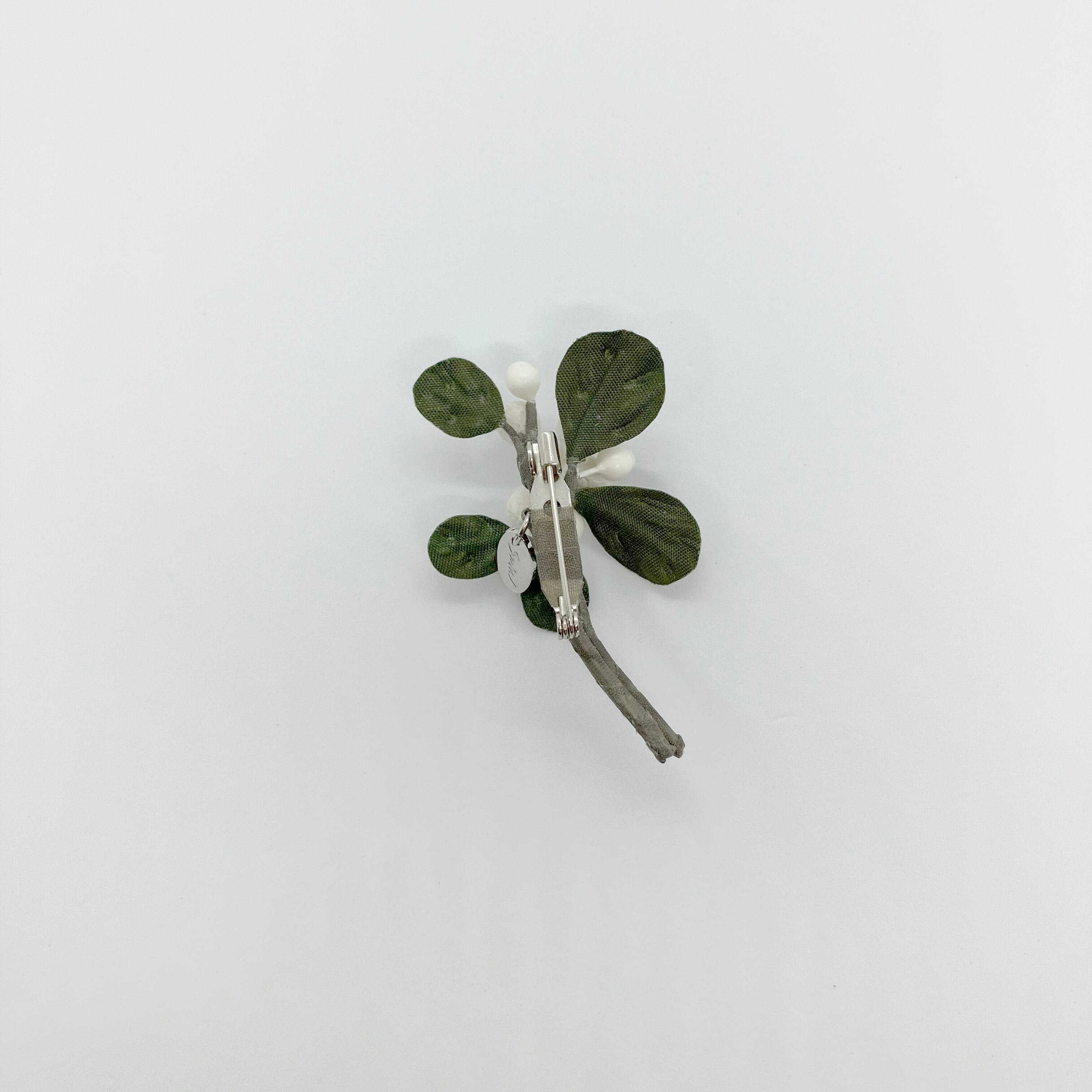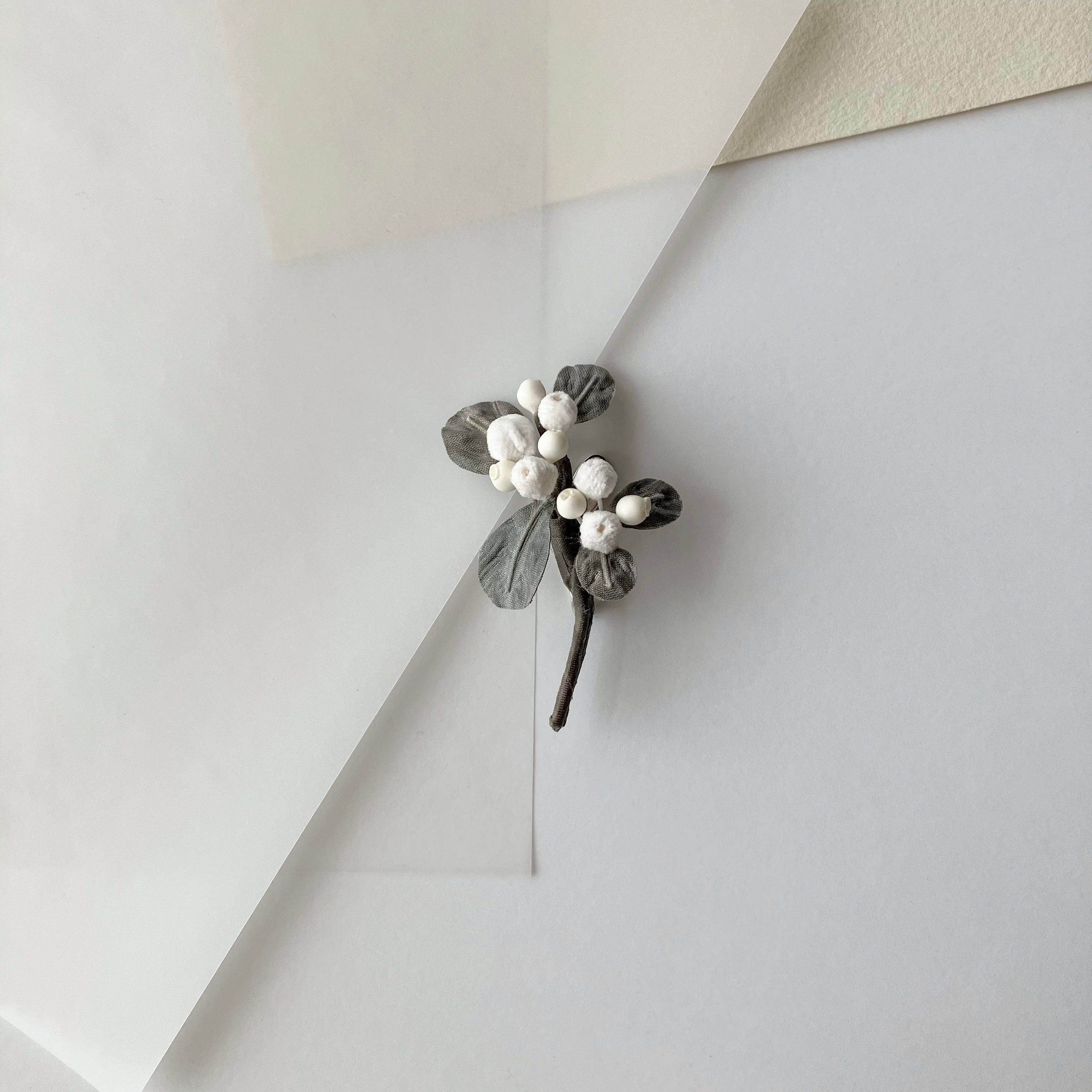 夏を越えて雪のような白い実をつけるセッコウボクを小さなブローチに。枝先に実ってしなる愛らしさと、寒空に溶け込む色づかいで日々の装いに季節感をプラス。