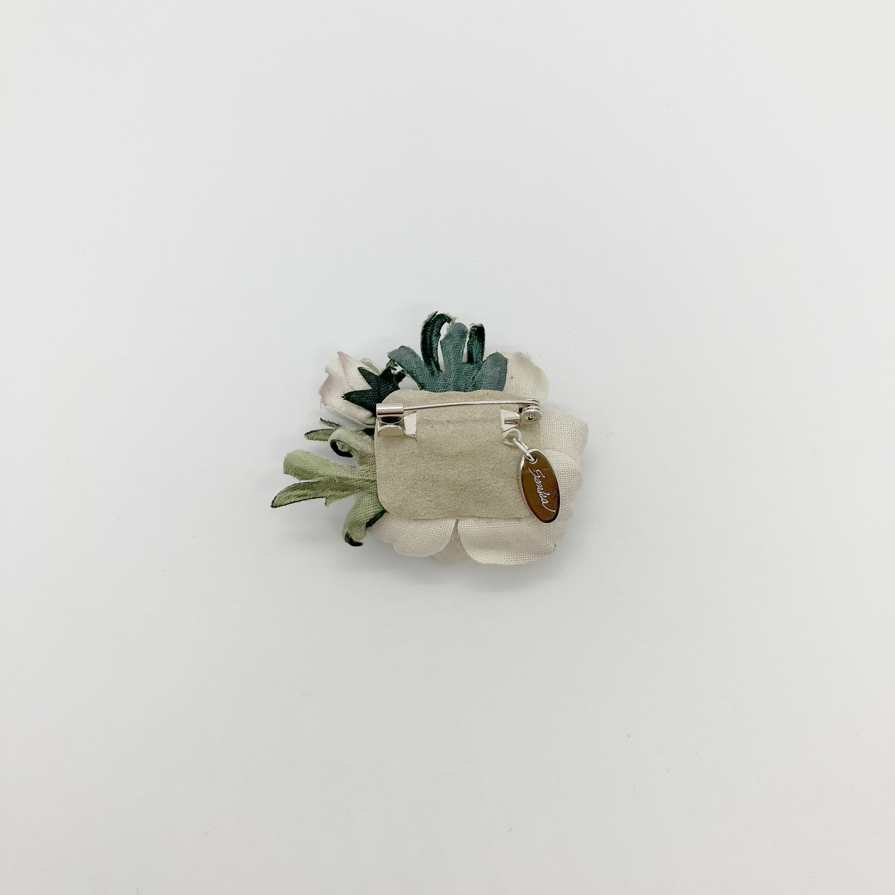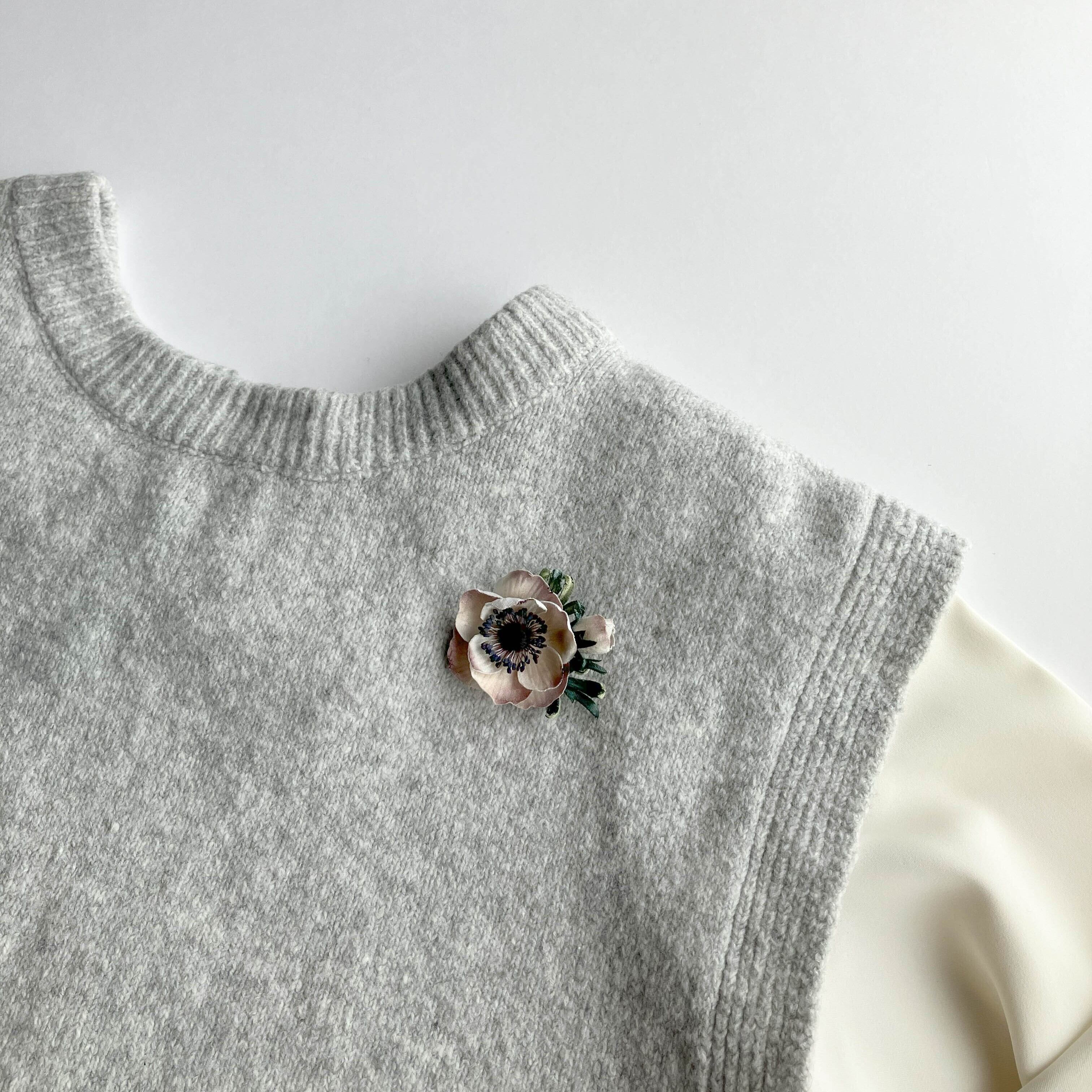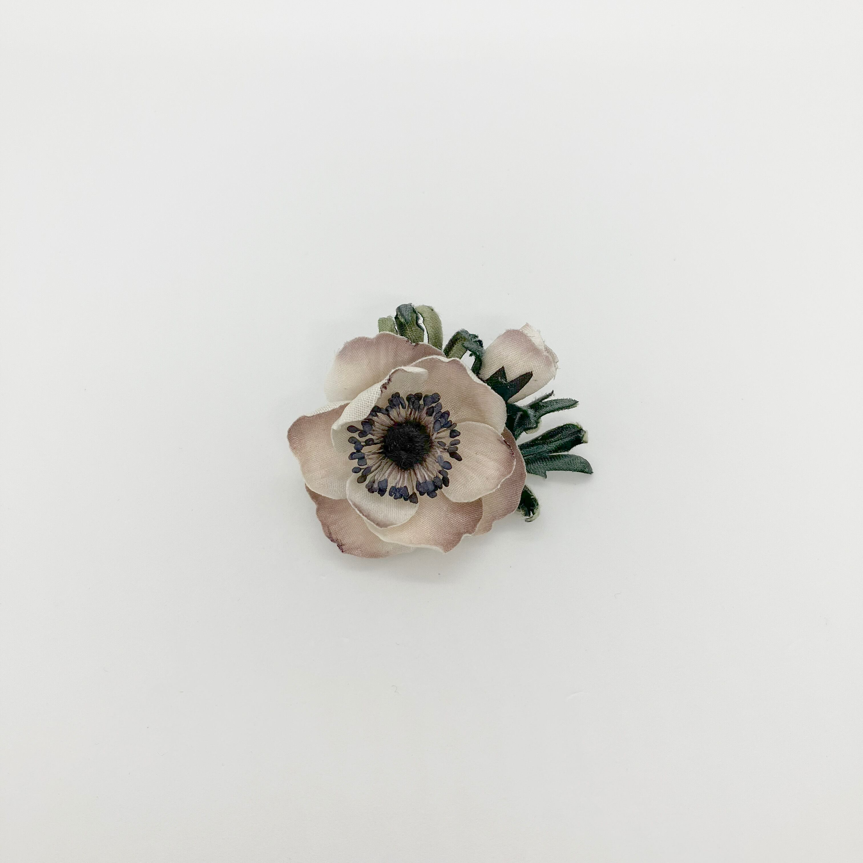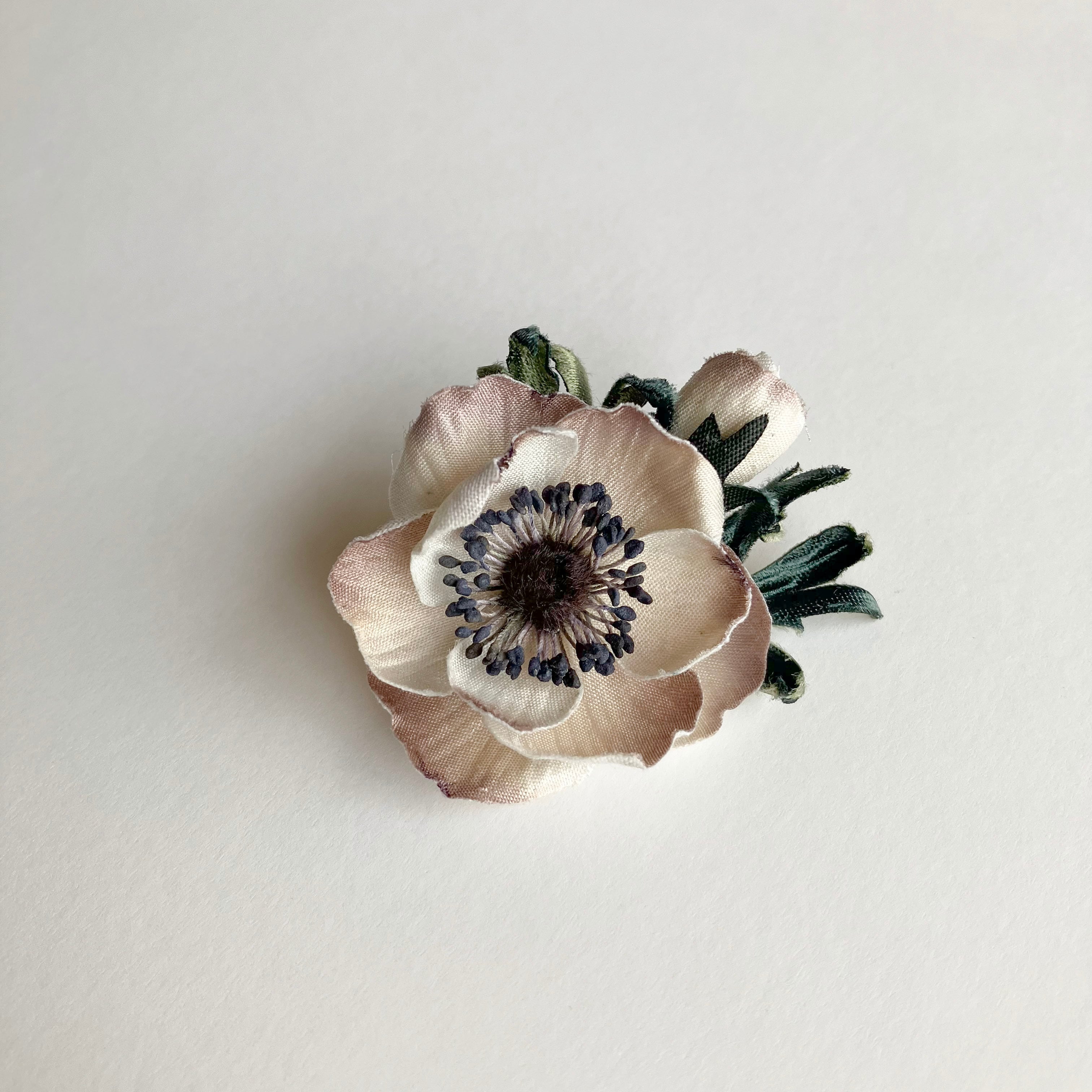 じんわりと滲むようにやさしく色づくアネモネのブローチ。花びらから感じる温感や表情はアトリエ染花がこだわる染色ならでは。取り入れやすいサイズでシャツやニットなどのワンポイントに。