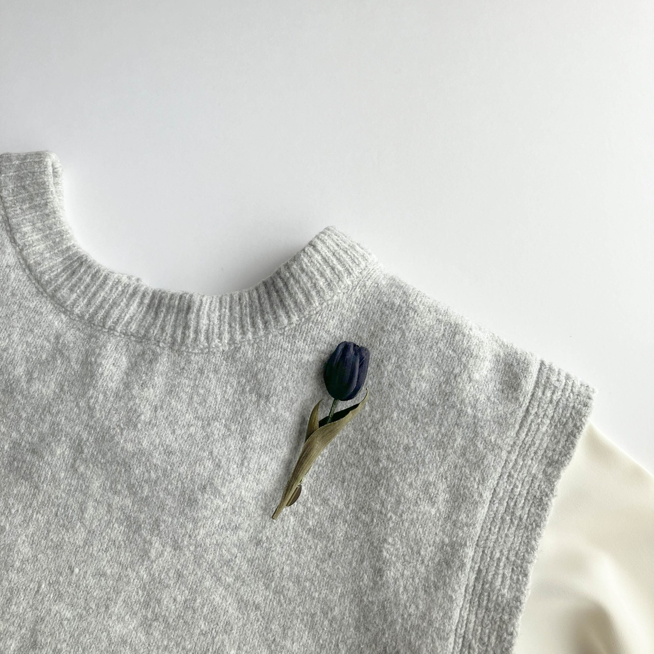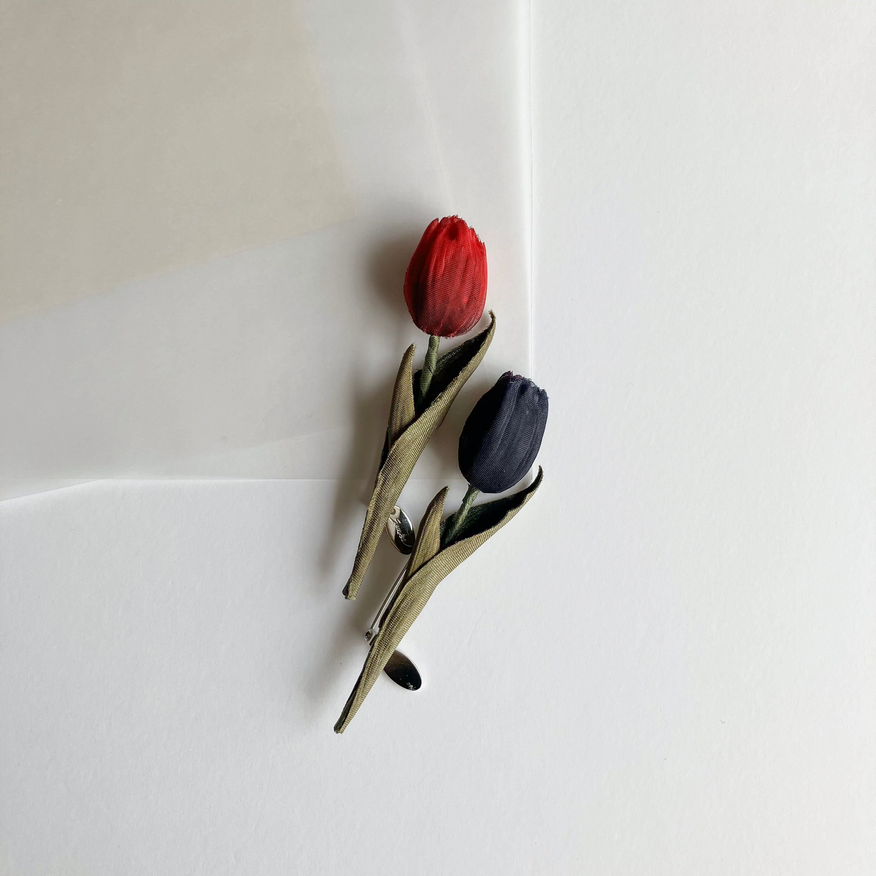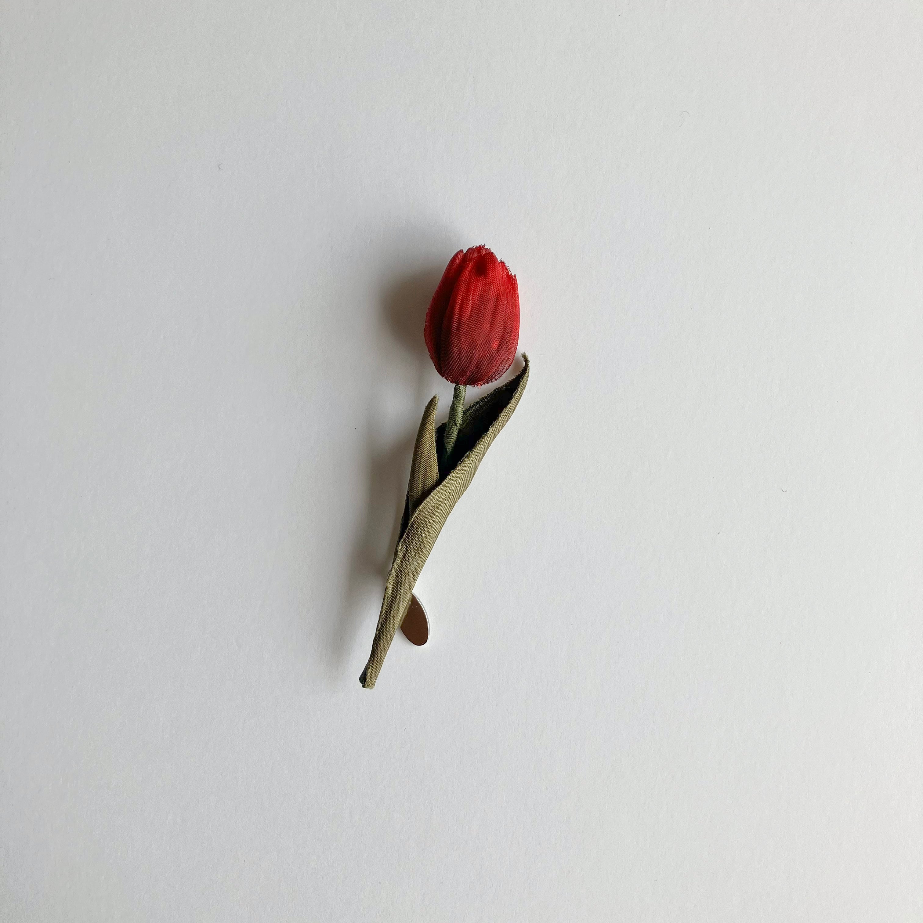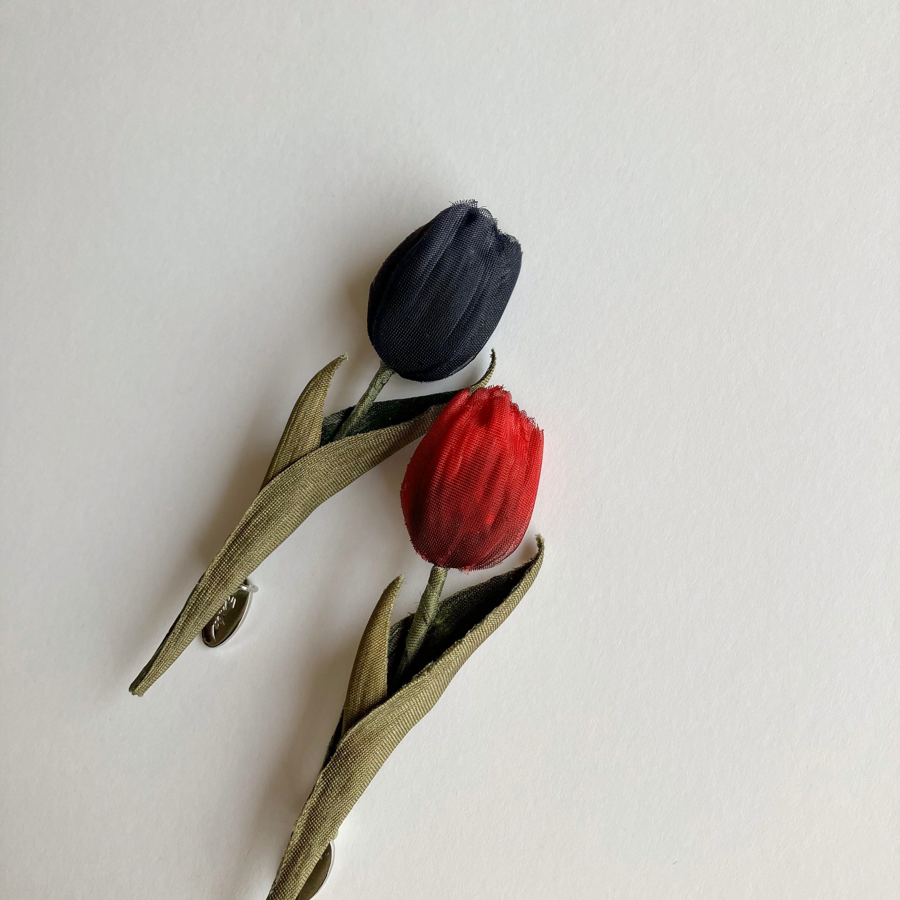愛らしいイメージのチューリップを大人っぽく。奥行きを感じさせる素材・色づかい、リーフがみせるわずかな動き…シンプルだからこそ細部にまでこだわり抜いたブローチです。