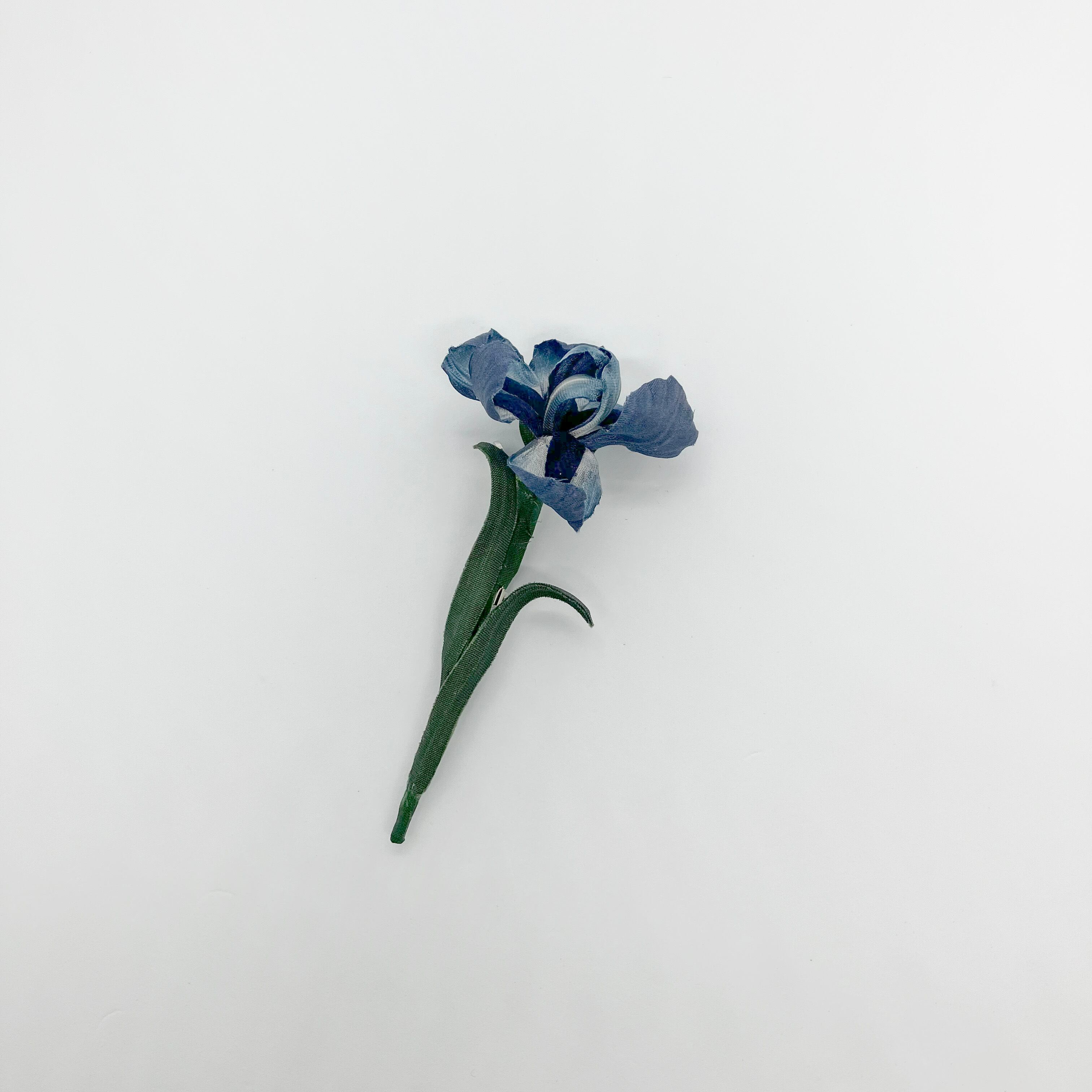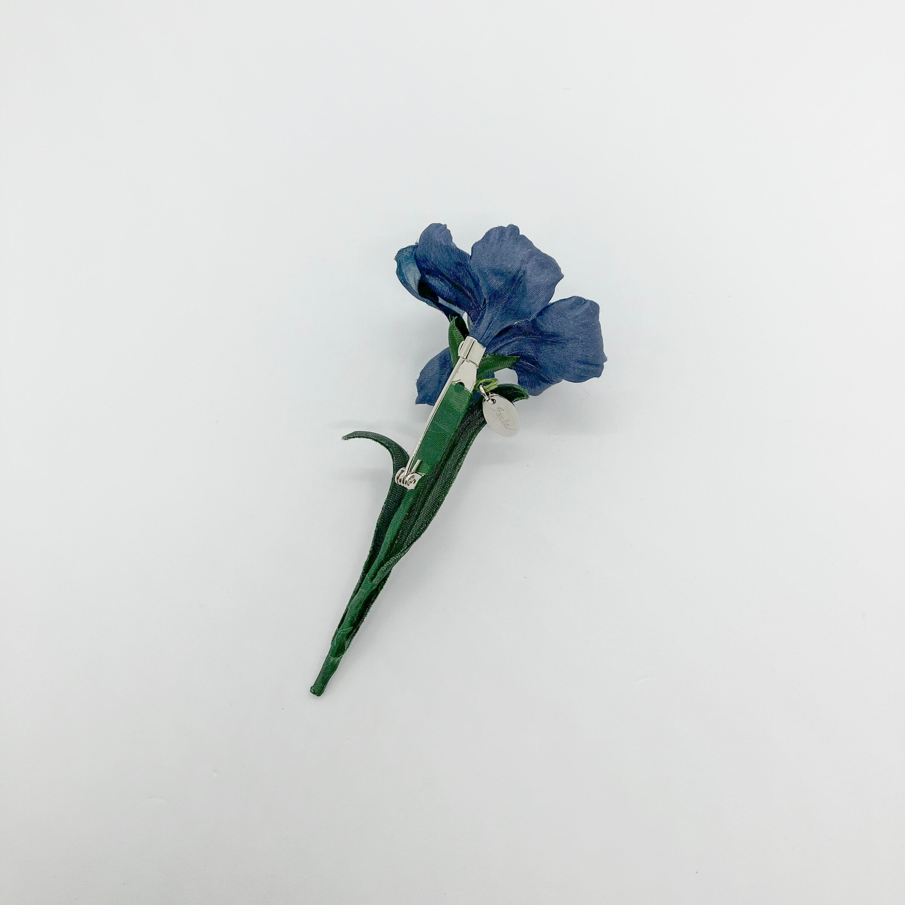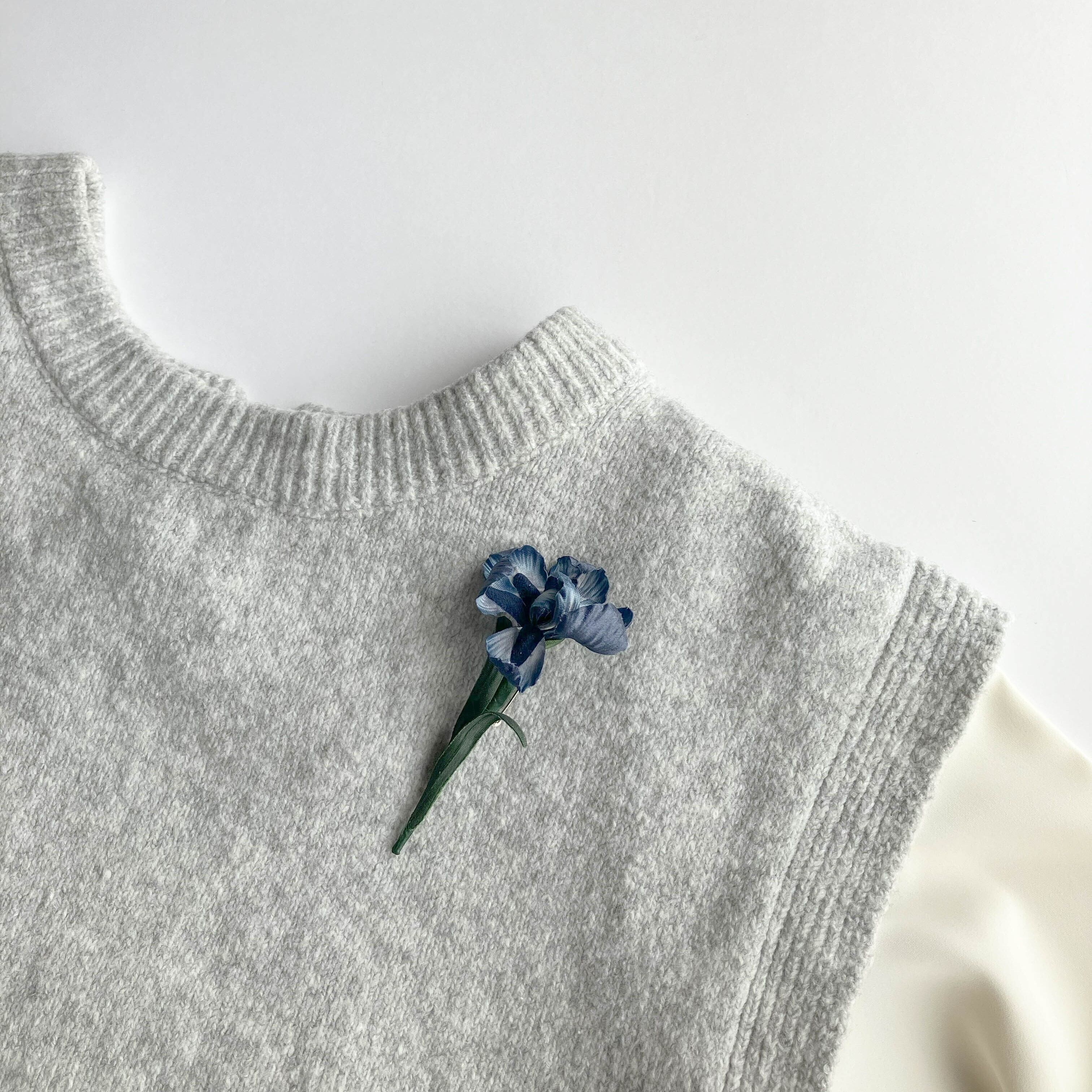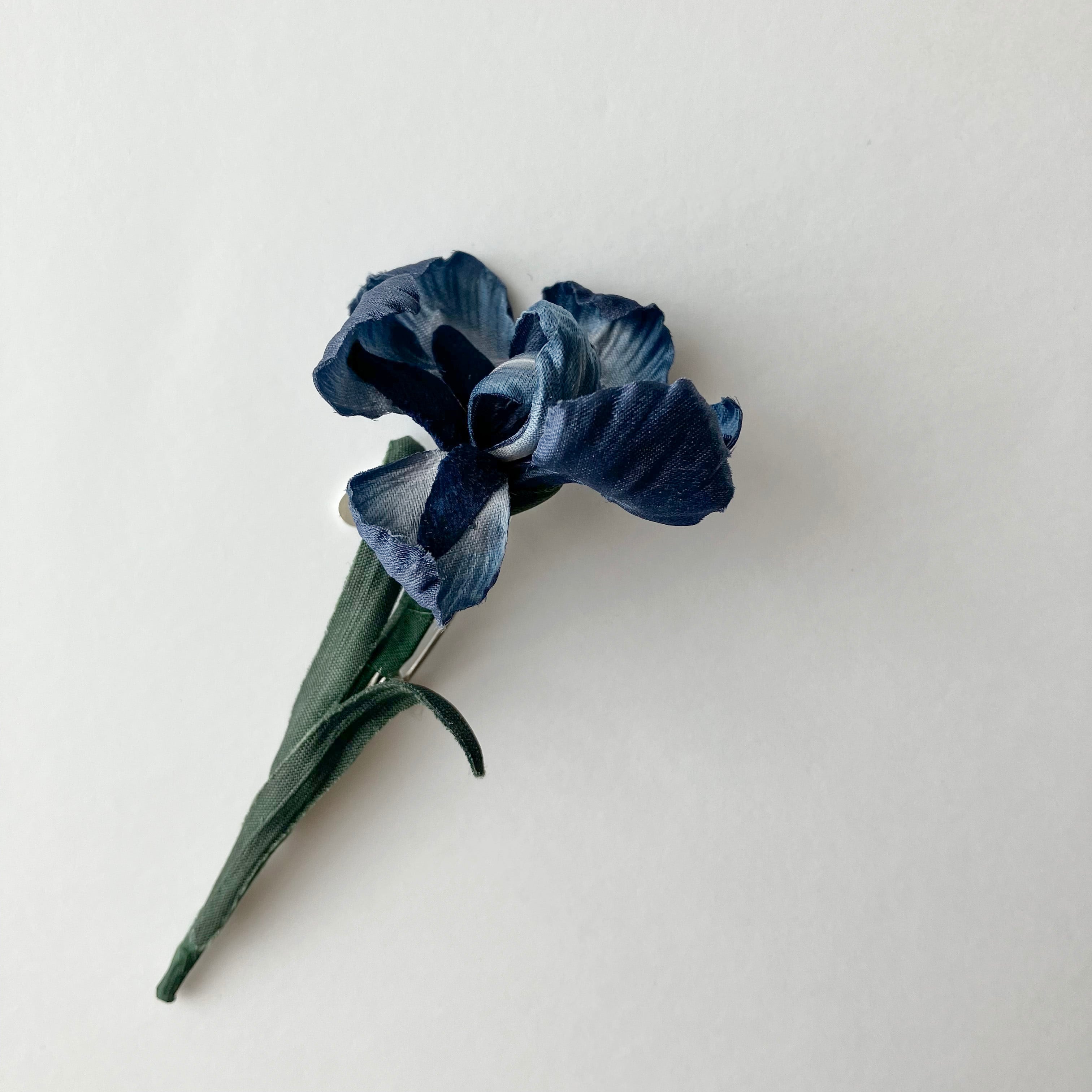 スッと真っ直ぐに咲いたアイリスの姿をブローチに。落ち着きあるブルーの花びらの程よい光沢感が上品に輝き、大人な印象に。