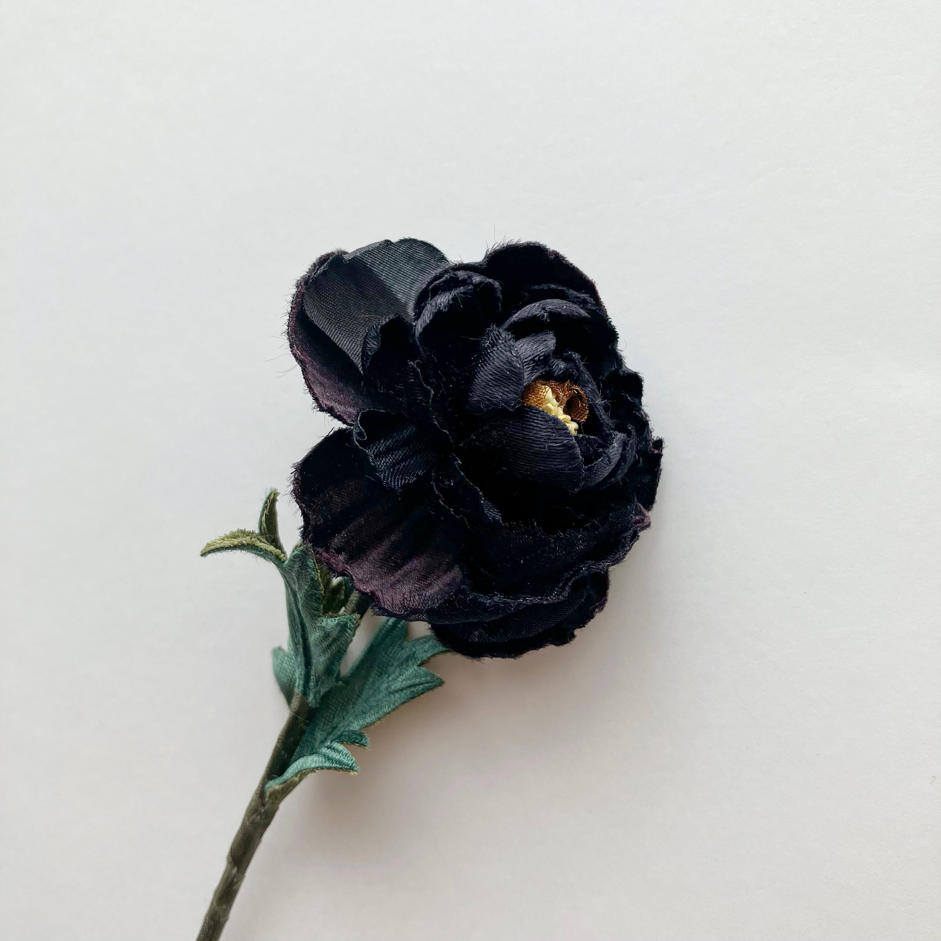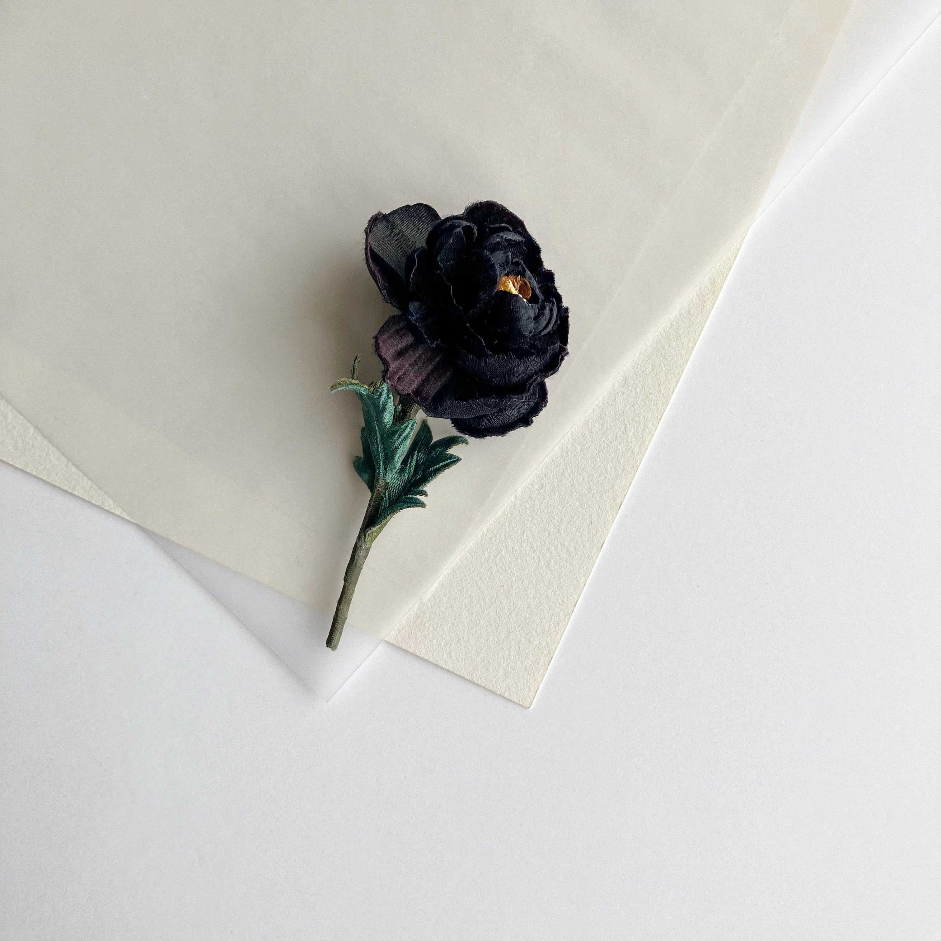 濃く深く染まったラナンキュラス。わずかな違いの色や素材を重ね、ワントーンでも映える洗練されたノワール(黒)を表現。