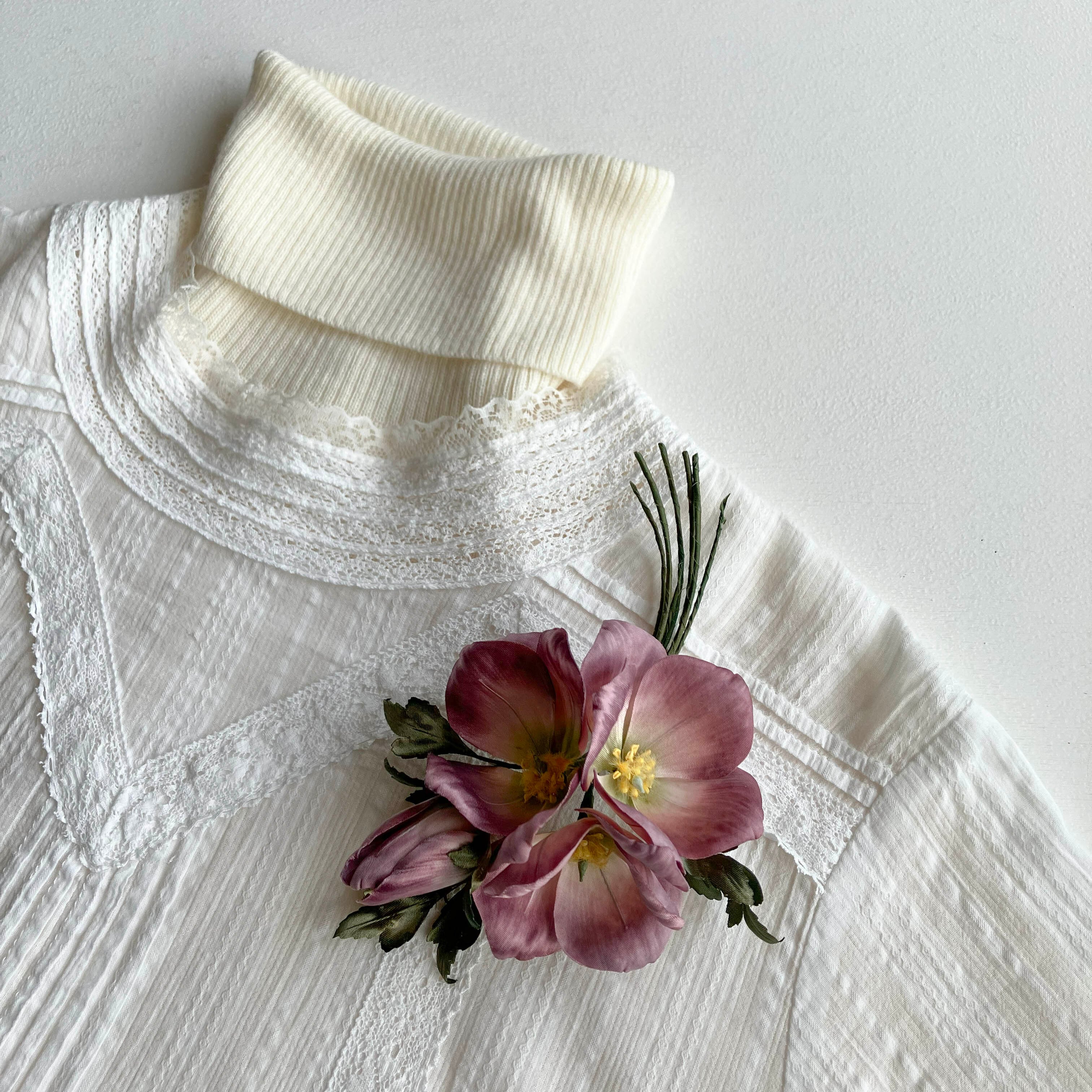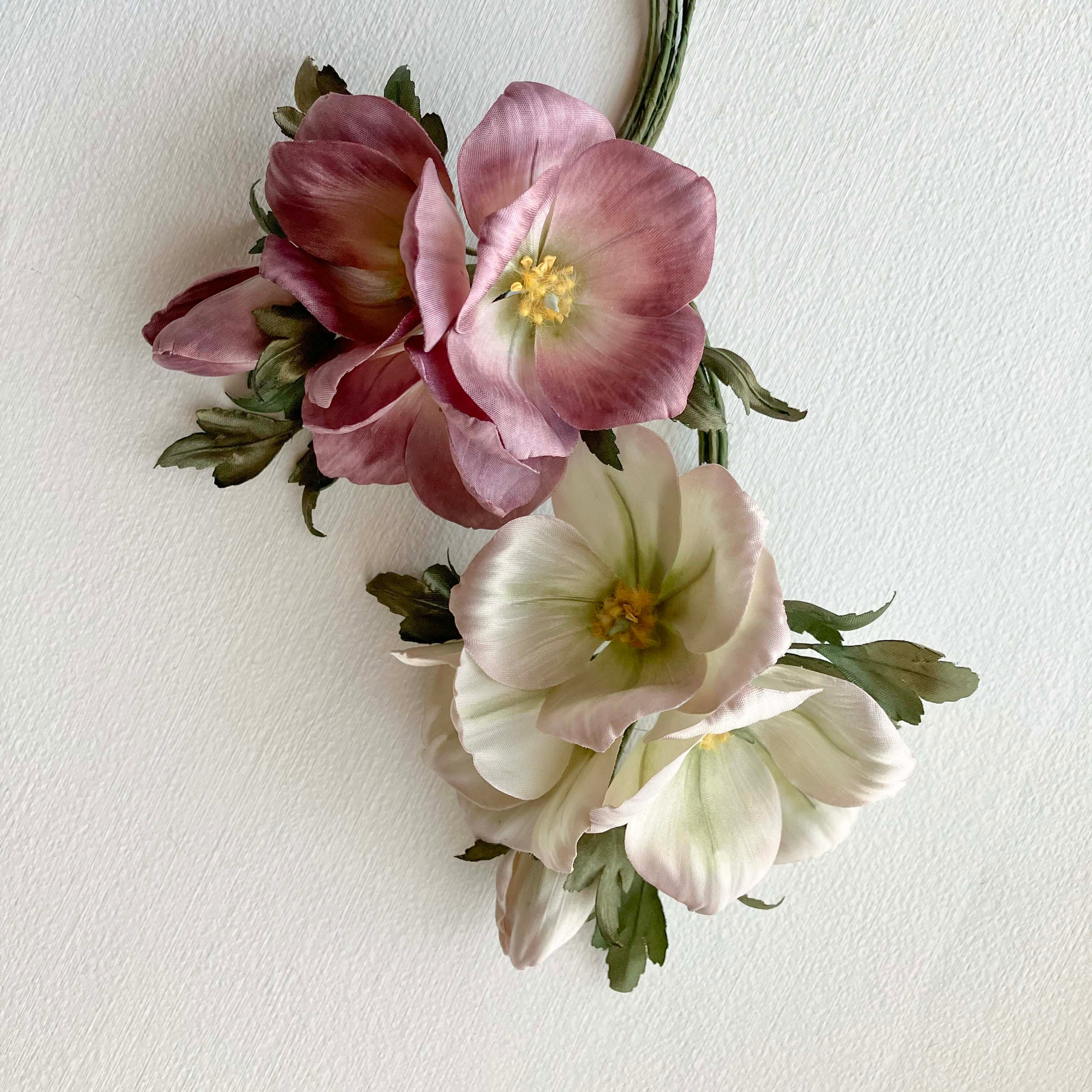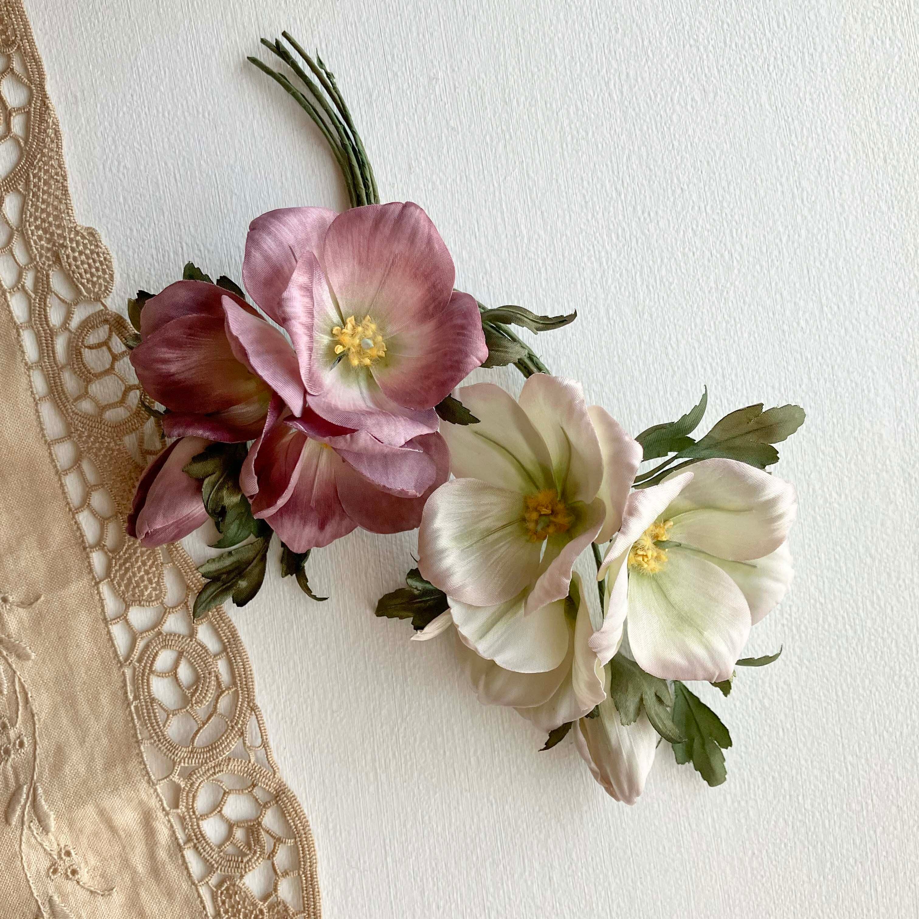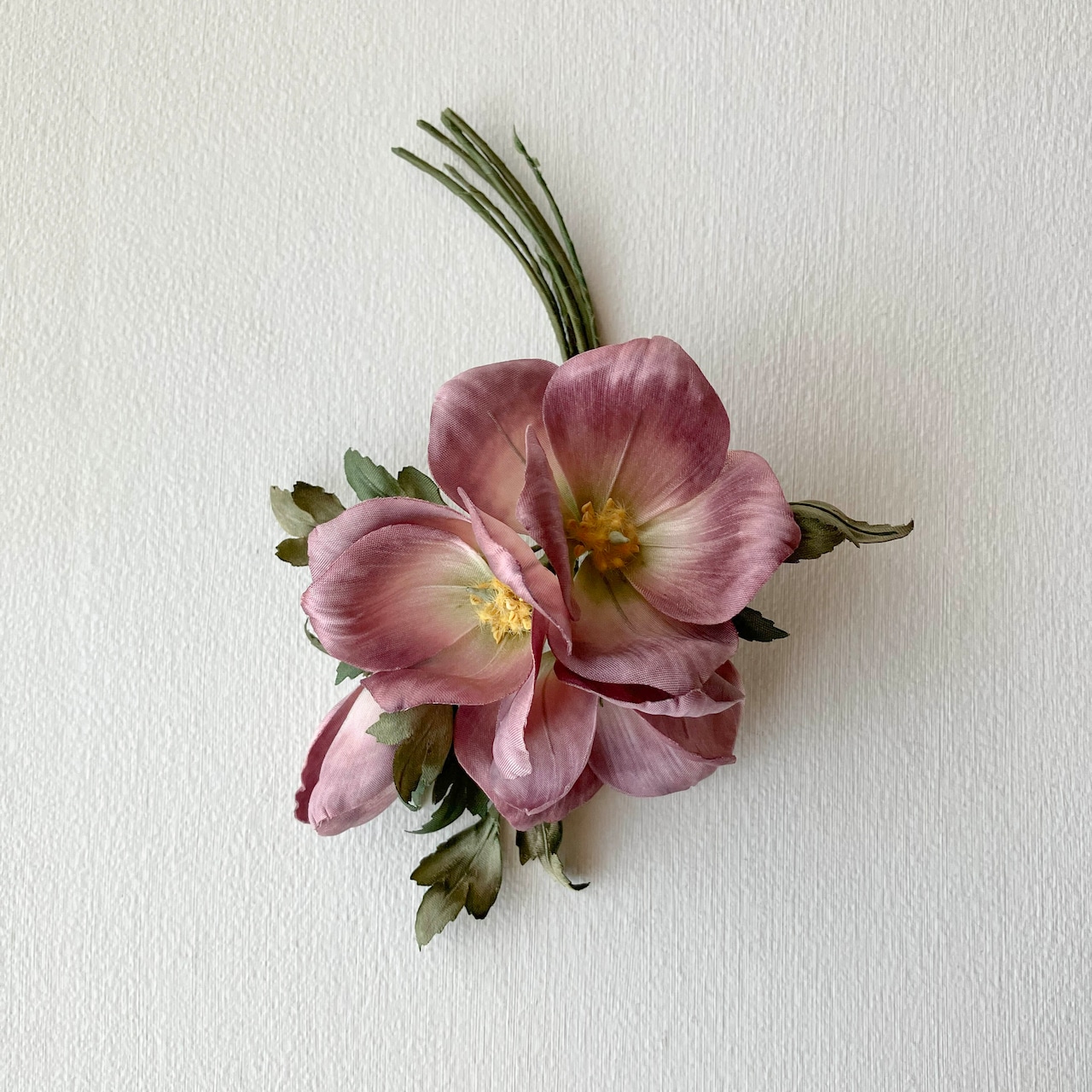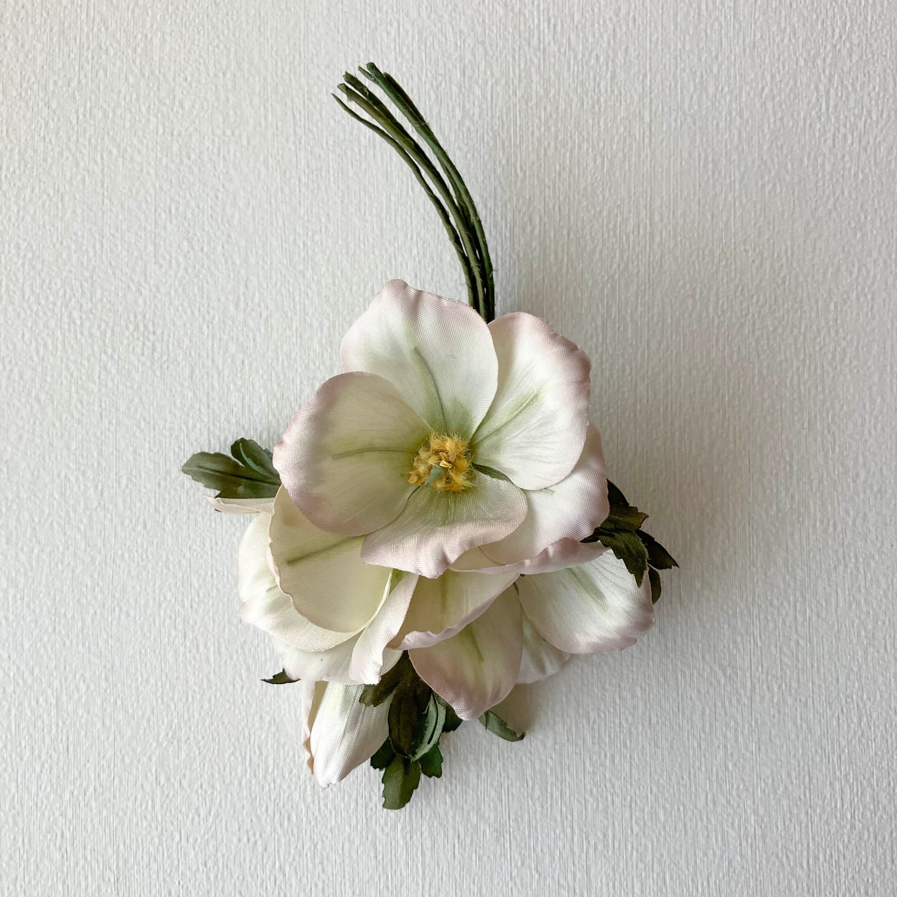 上品で美しいクリスマスローズのコサージュキット。儚げなオフ~ペールピンク、シックなパープルと色が特徴的なお花だからこそ見せる様々な表情にもこだわって染色をしています。程よい光沢感のある素材を活かした作り方で、冬の装いにも映えるコサージュ作りをお楽しみください。数量限定の販売となります。