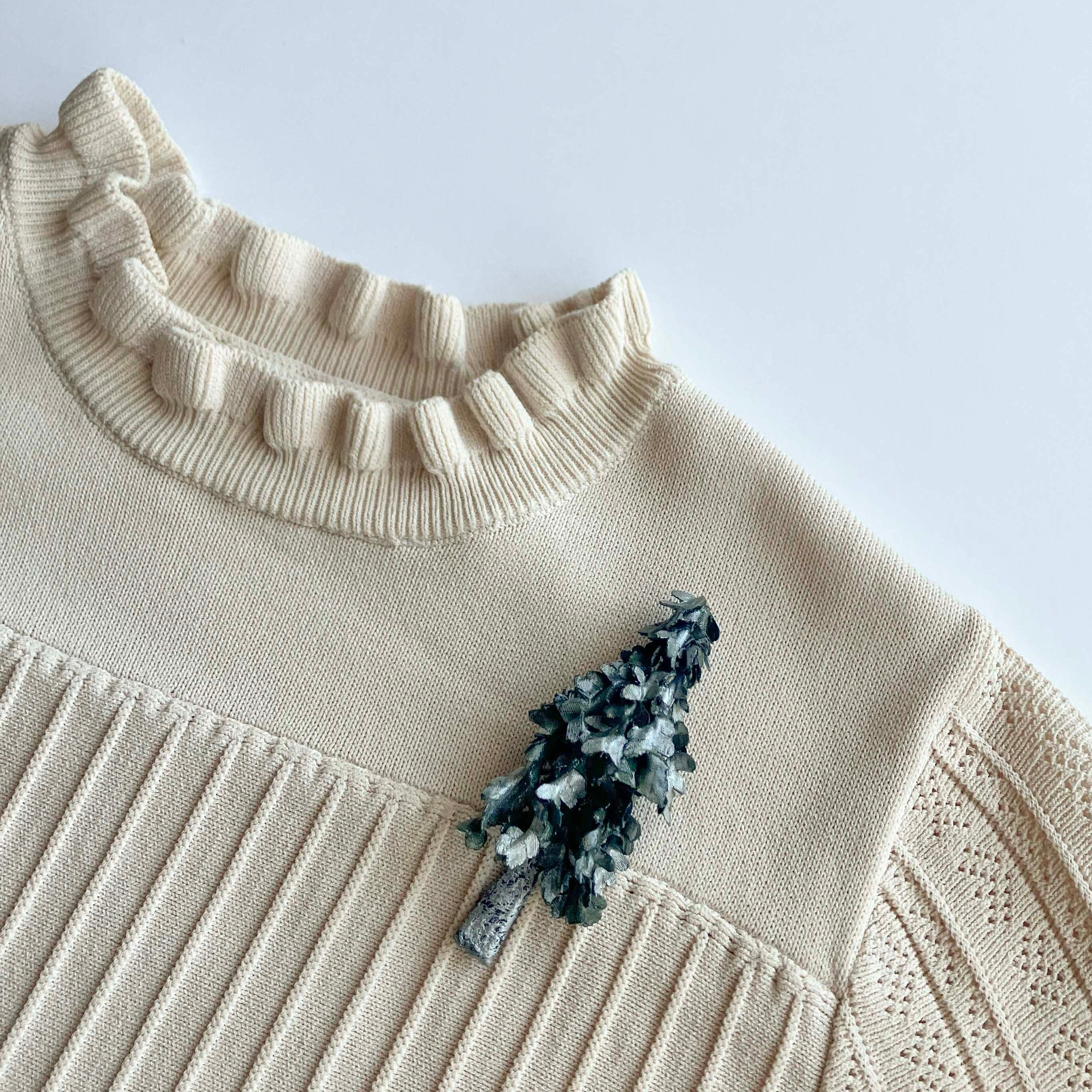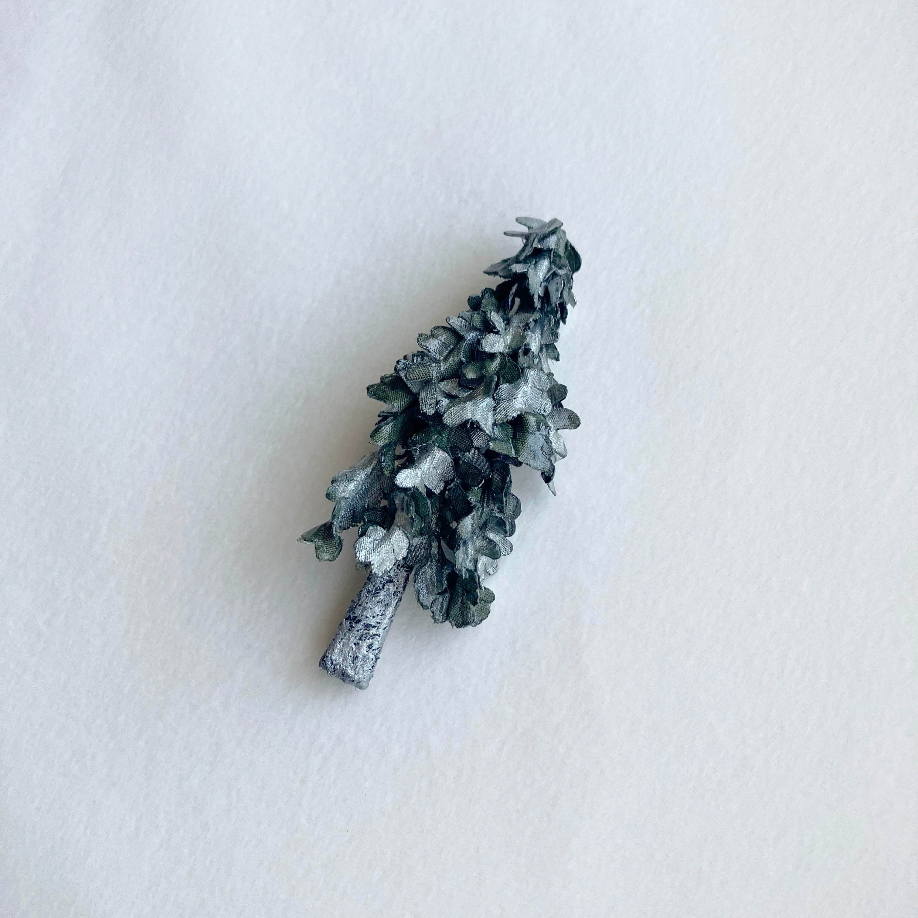 雪の積もった木が並ぶ深い深い冬の森。風の音か、はたまた何かが潜んでいるのか…ざわざわと今にも動き出しそうな、想像力をかき立てる魅力的な木のブローチ。ランダムに見え隠れするシルバーラメが雪景色を思わせ、雰囲気をぐっと高めます。