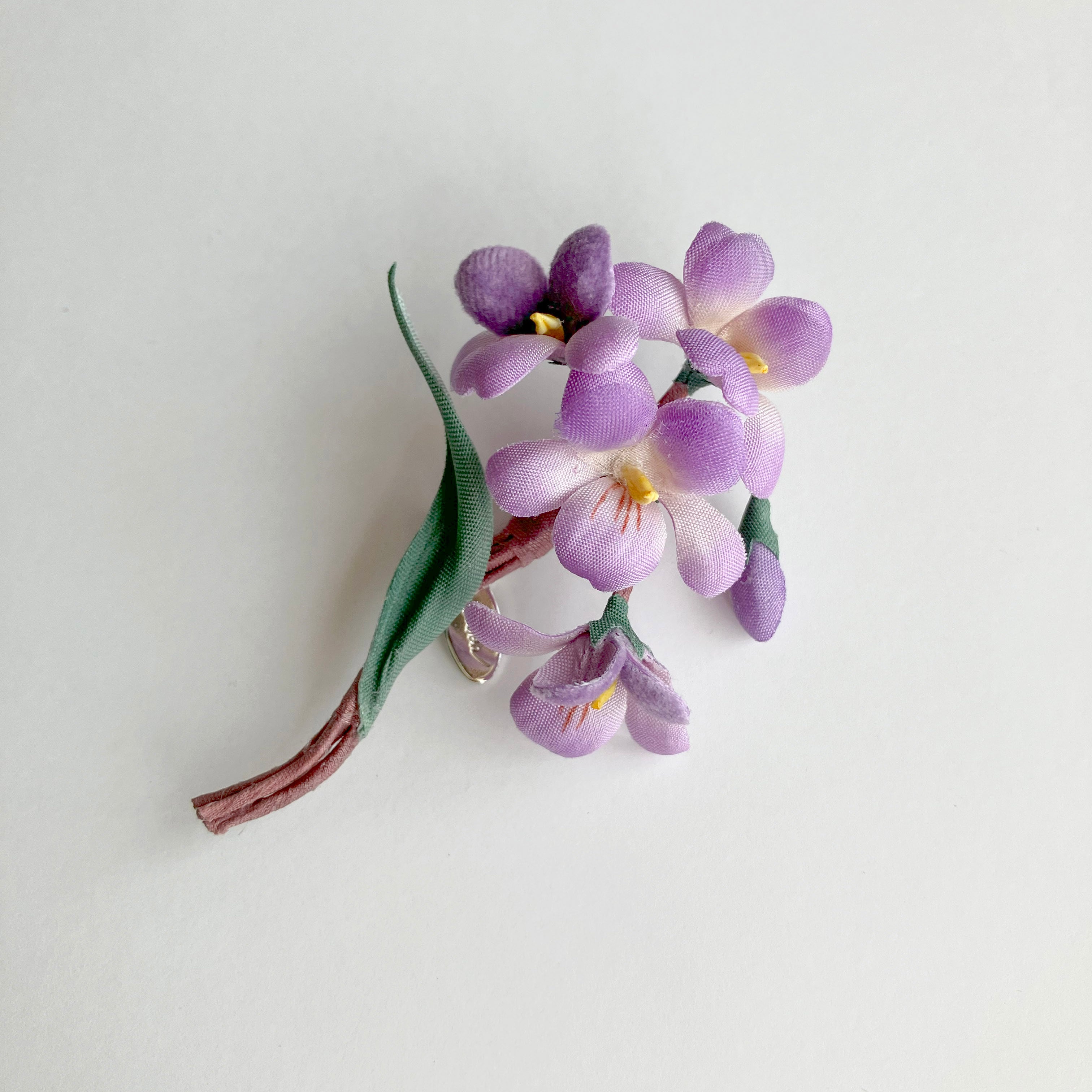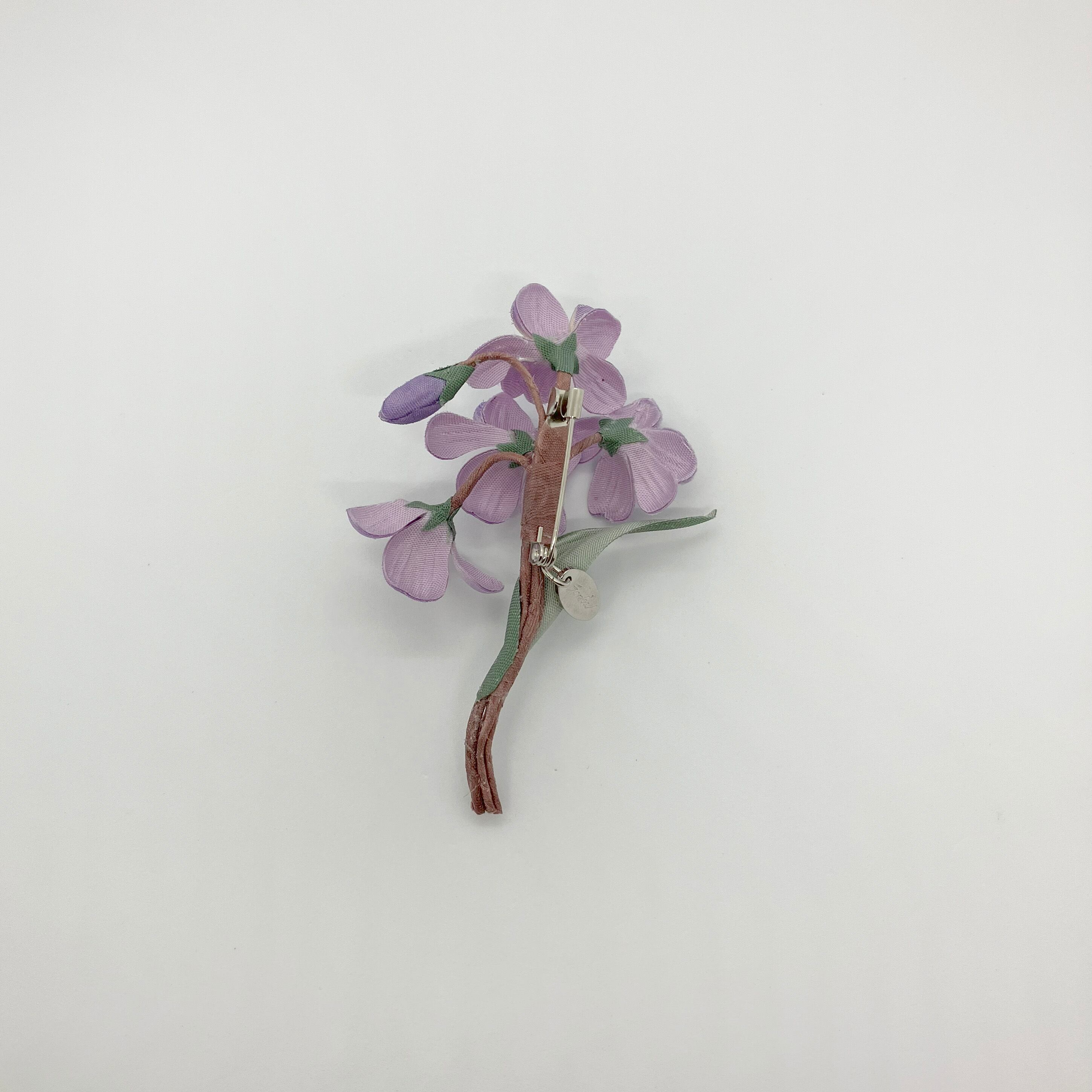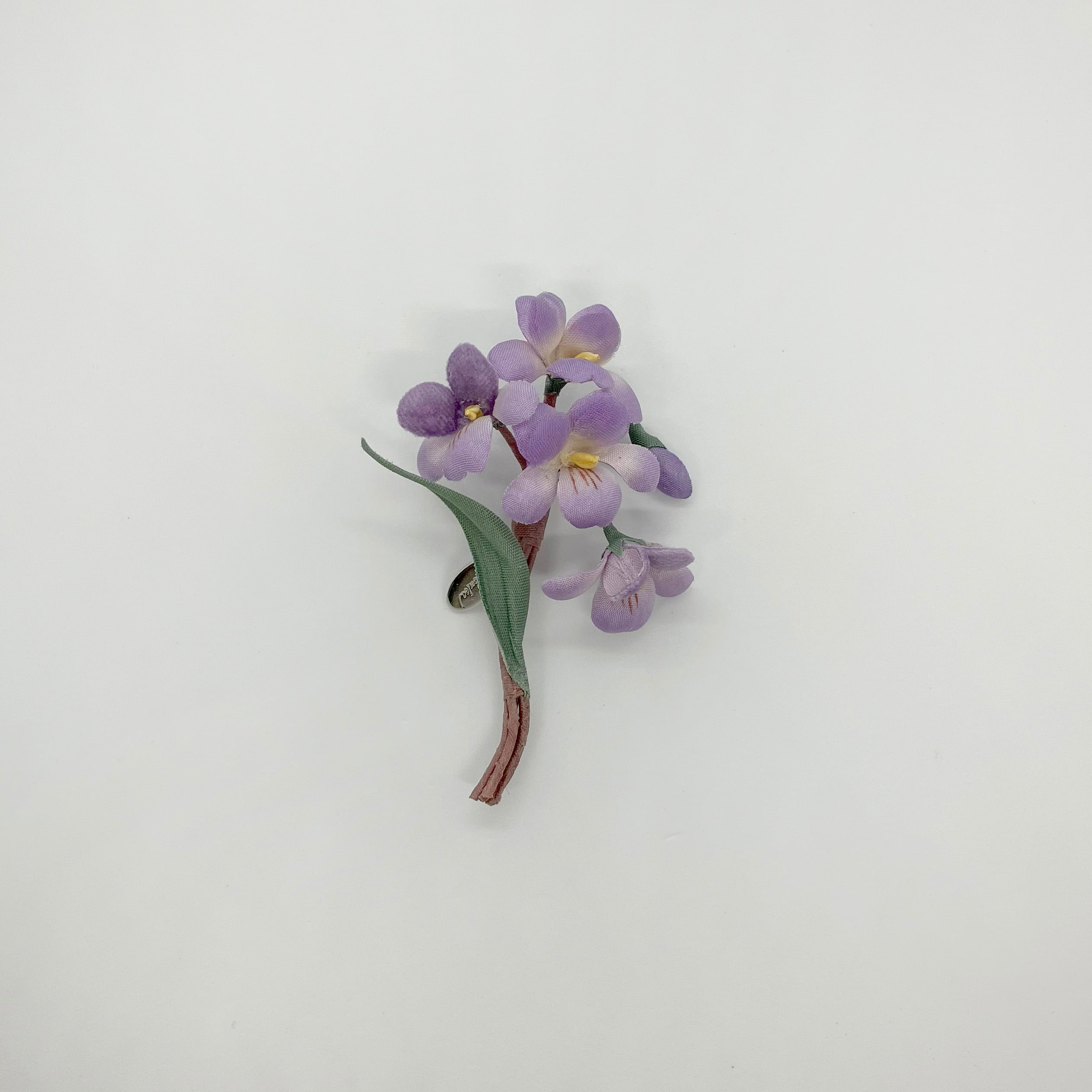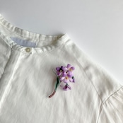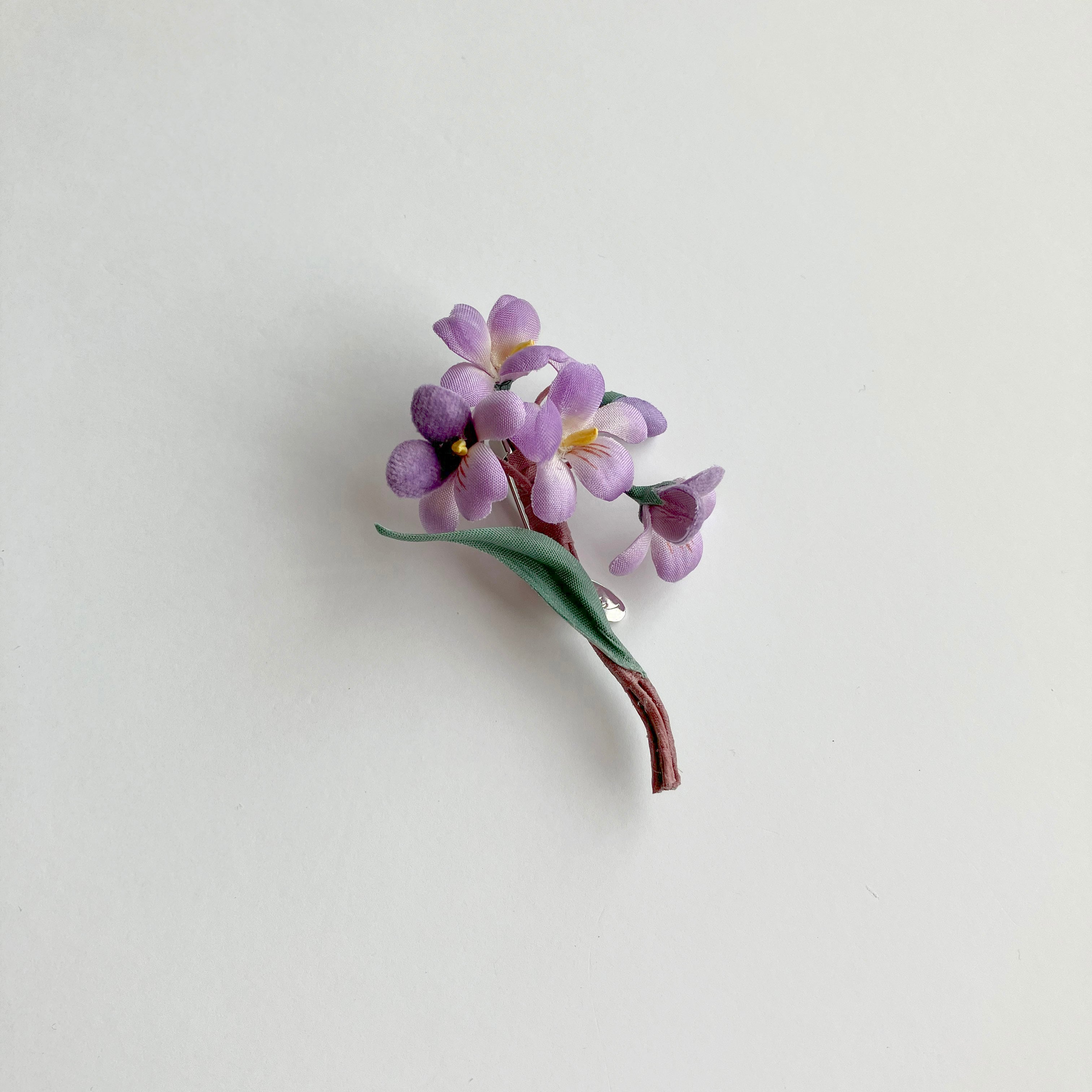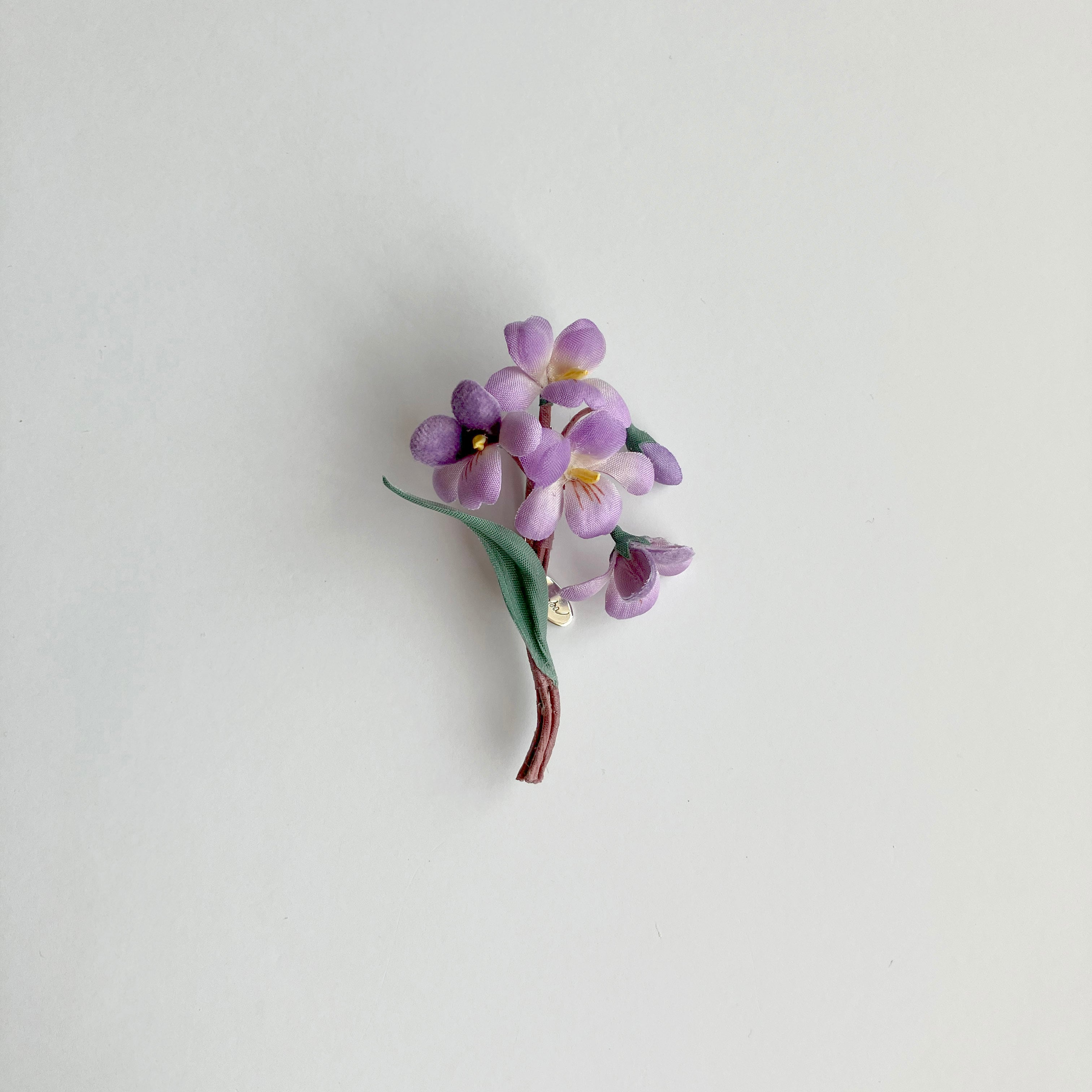 素材の違いで見せる濃淡と抜け感にこだわったパープルが大人かわいいスミレのブローチ。ユーモアのある生き生きとした表情で装いを明るく彩ります。