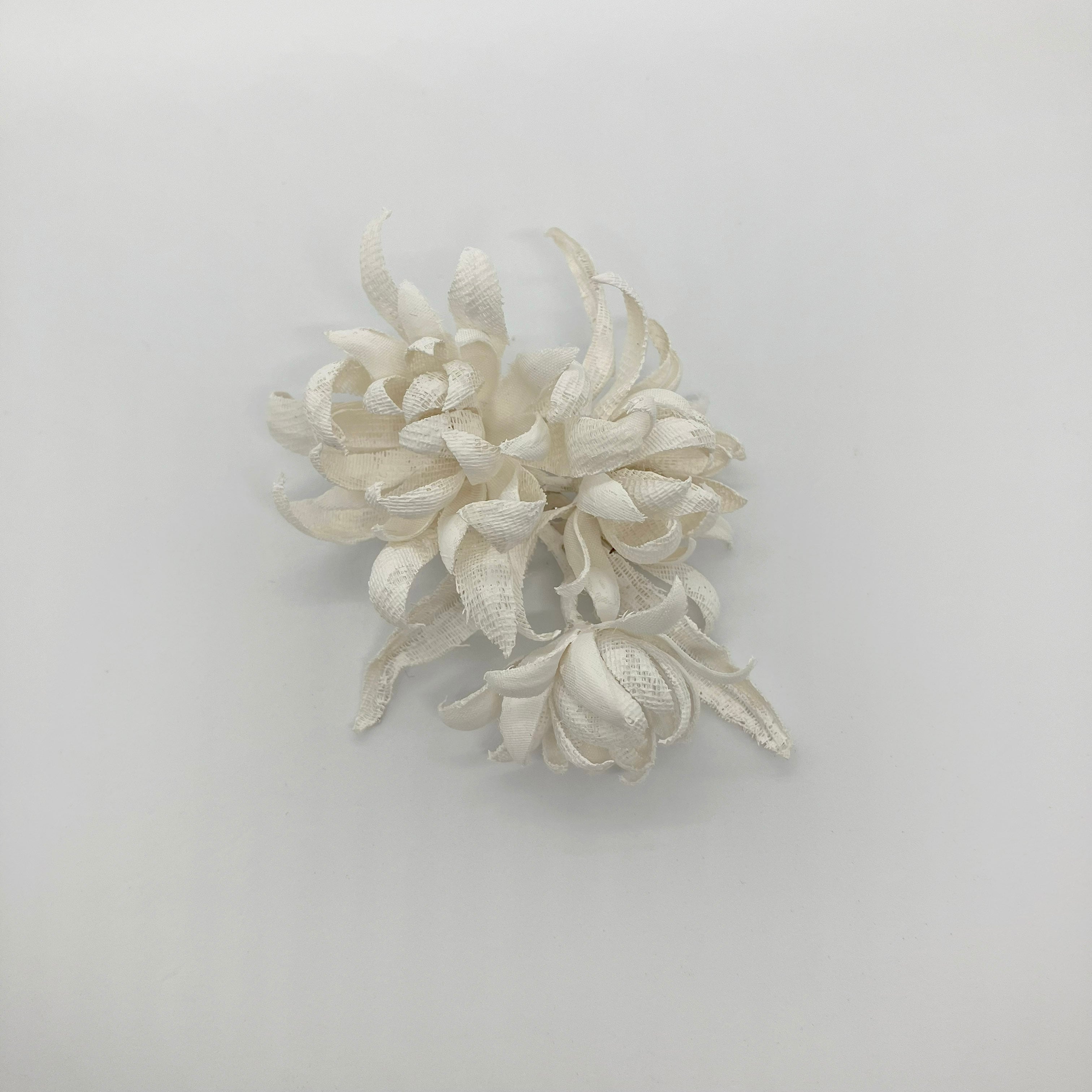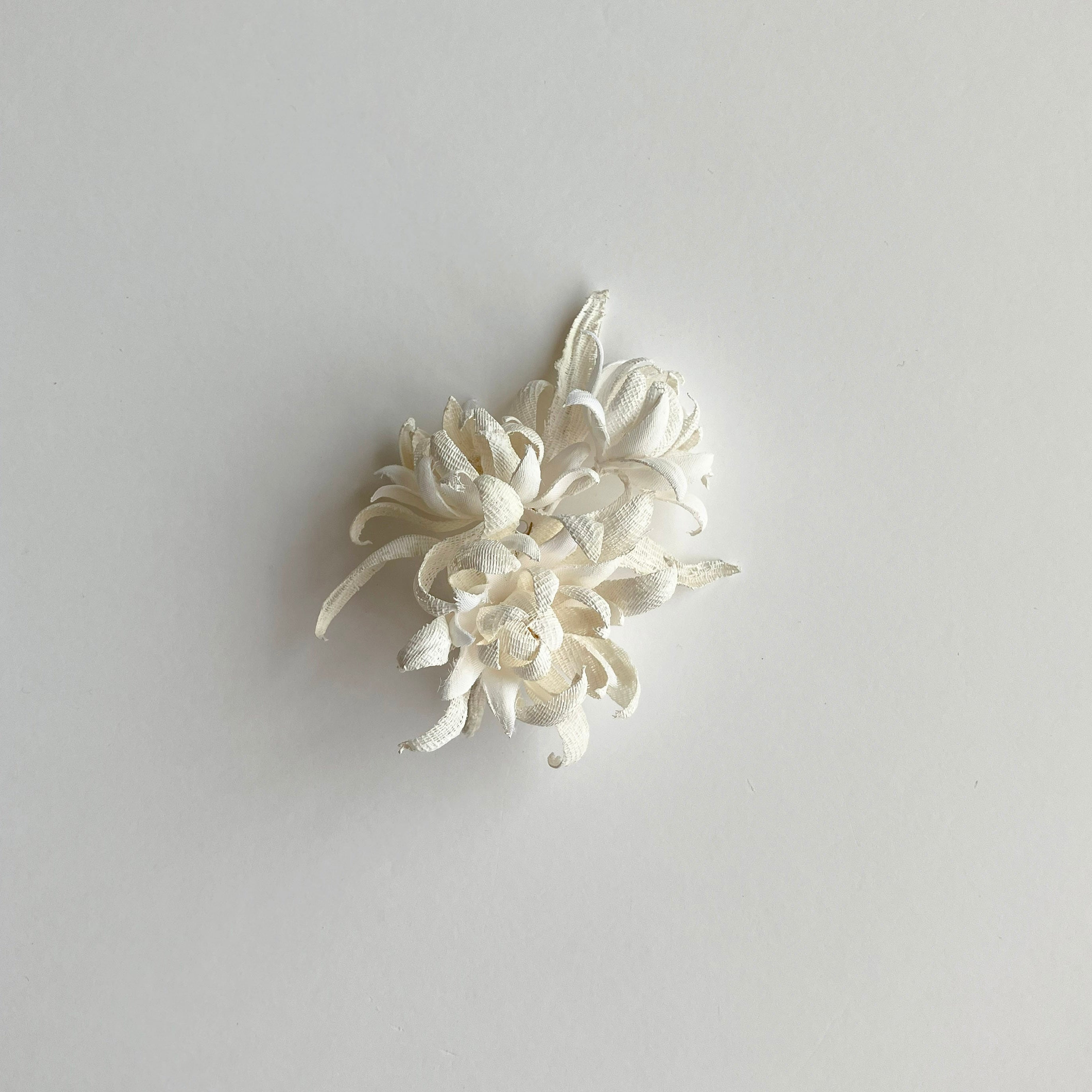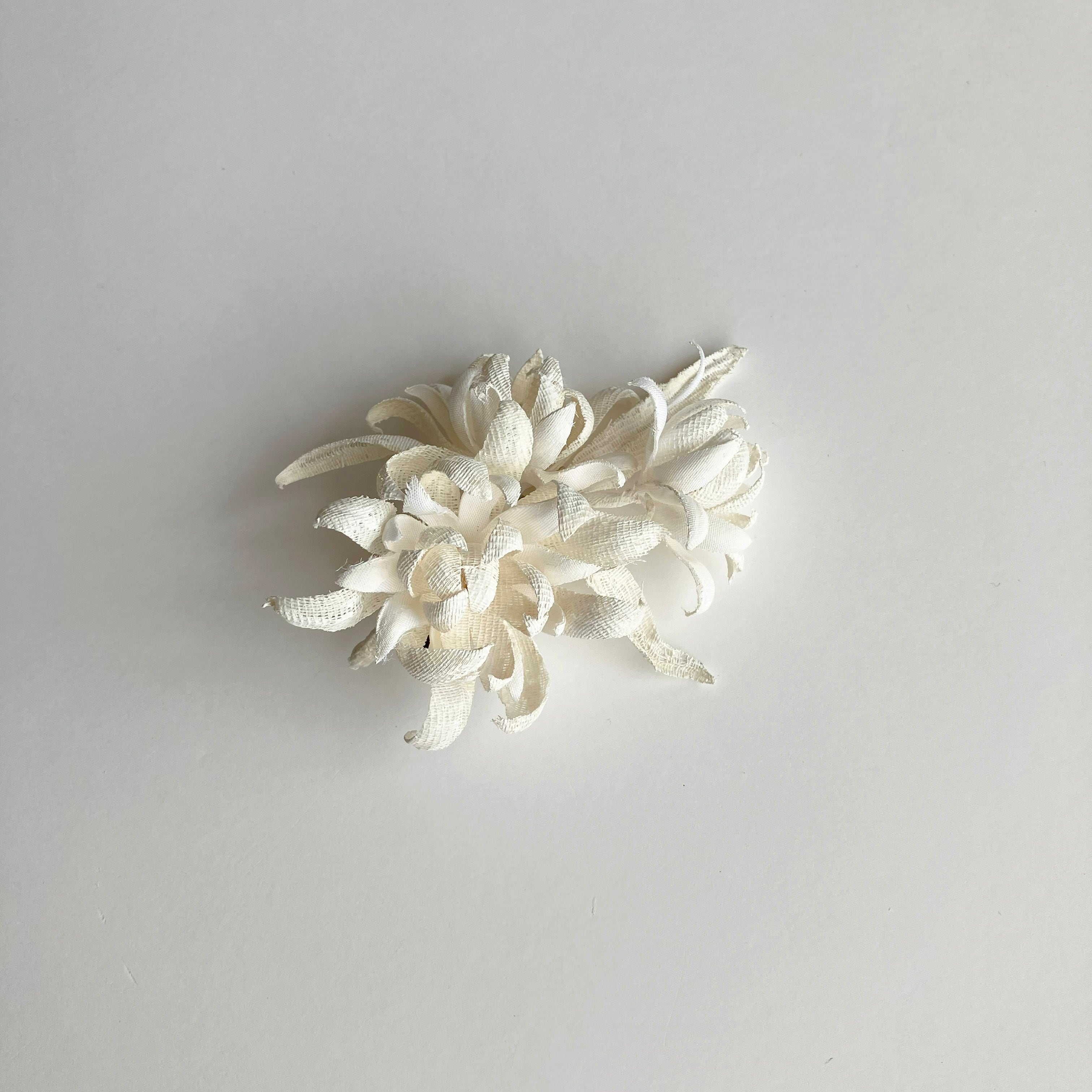 やわらかさ、目の粗さなど特徴の異なる素材を取り入れたコサージュ。ペイントによる陶器のようなマットな質感と立体感にこだわりました。様々な要素を自然に取り込んだデザインで、シンプルながらにもしっかりと存在感を見せてくれるアイテムです。