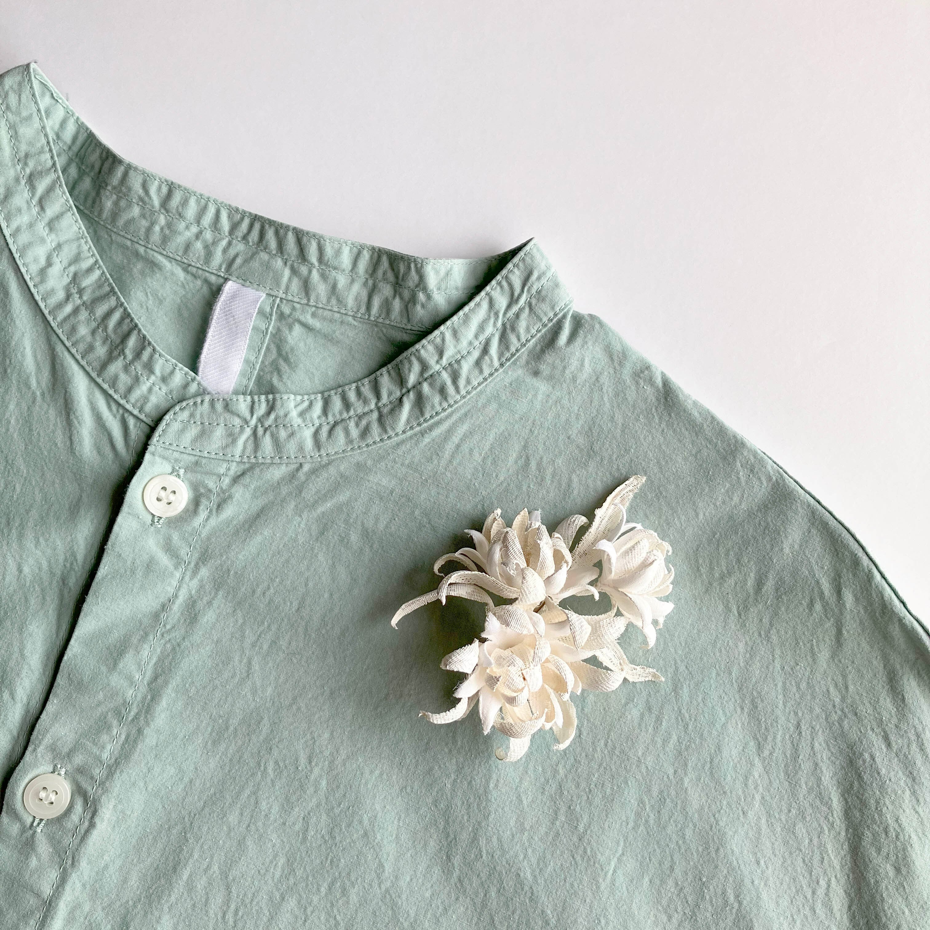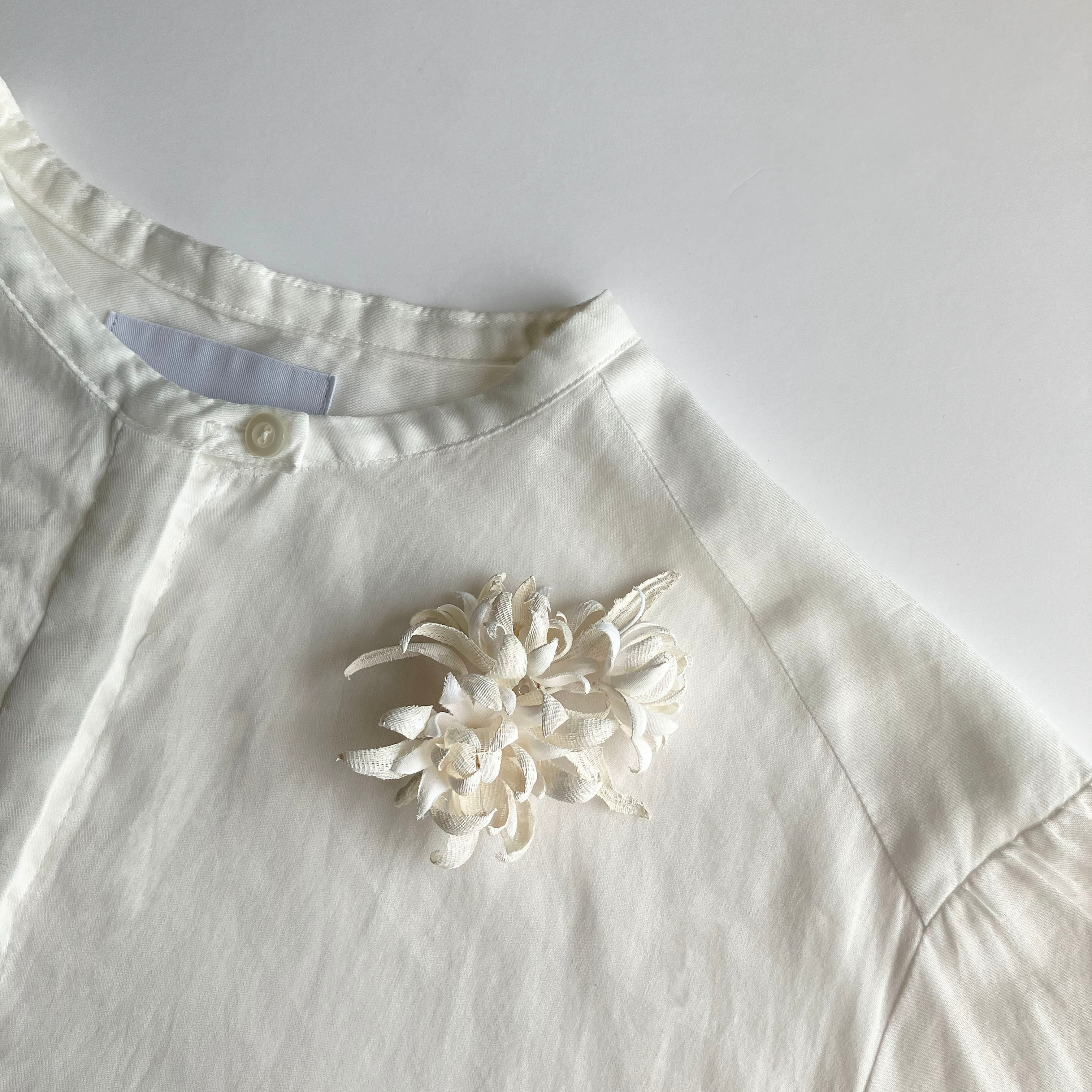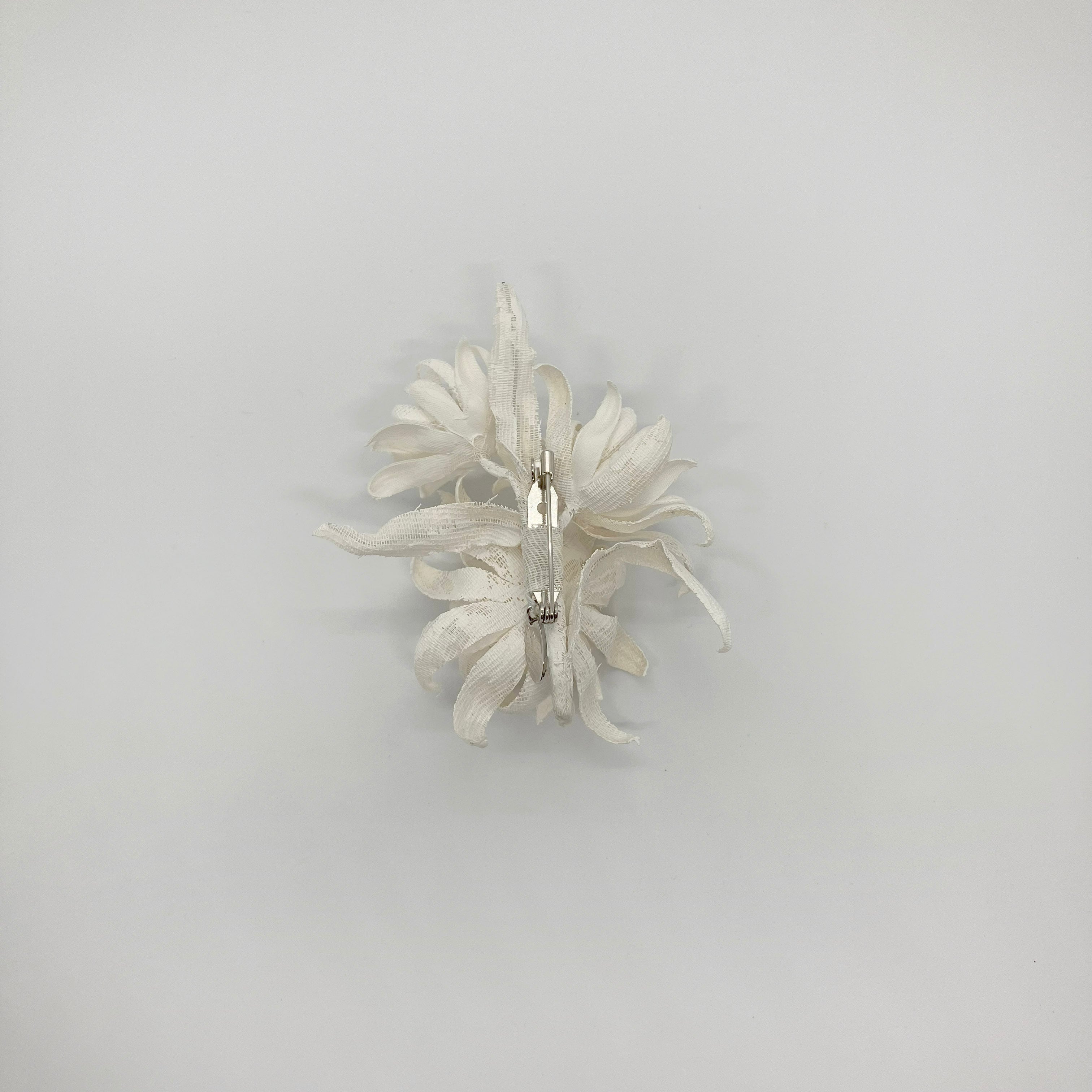 やわらかさ、目の粗さなど特徴の異なる素材を取り入れたコサージュ。ペイントによる陶器のようなマットな質感と立体感にこだわりました。様々な要素を自然に取り込んだデザインで、シンプルながらにもしっかりと存在感を見せてくれるアイテムです。