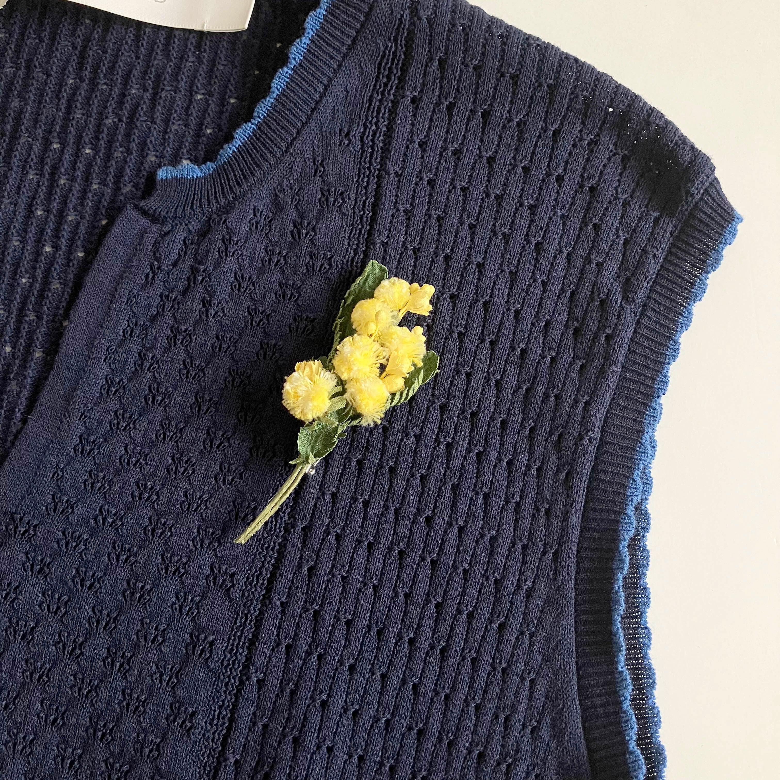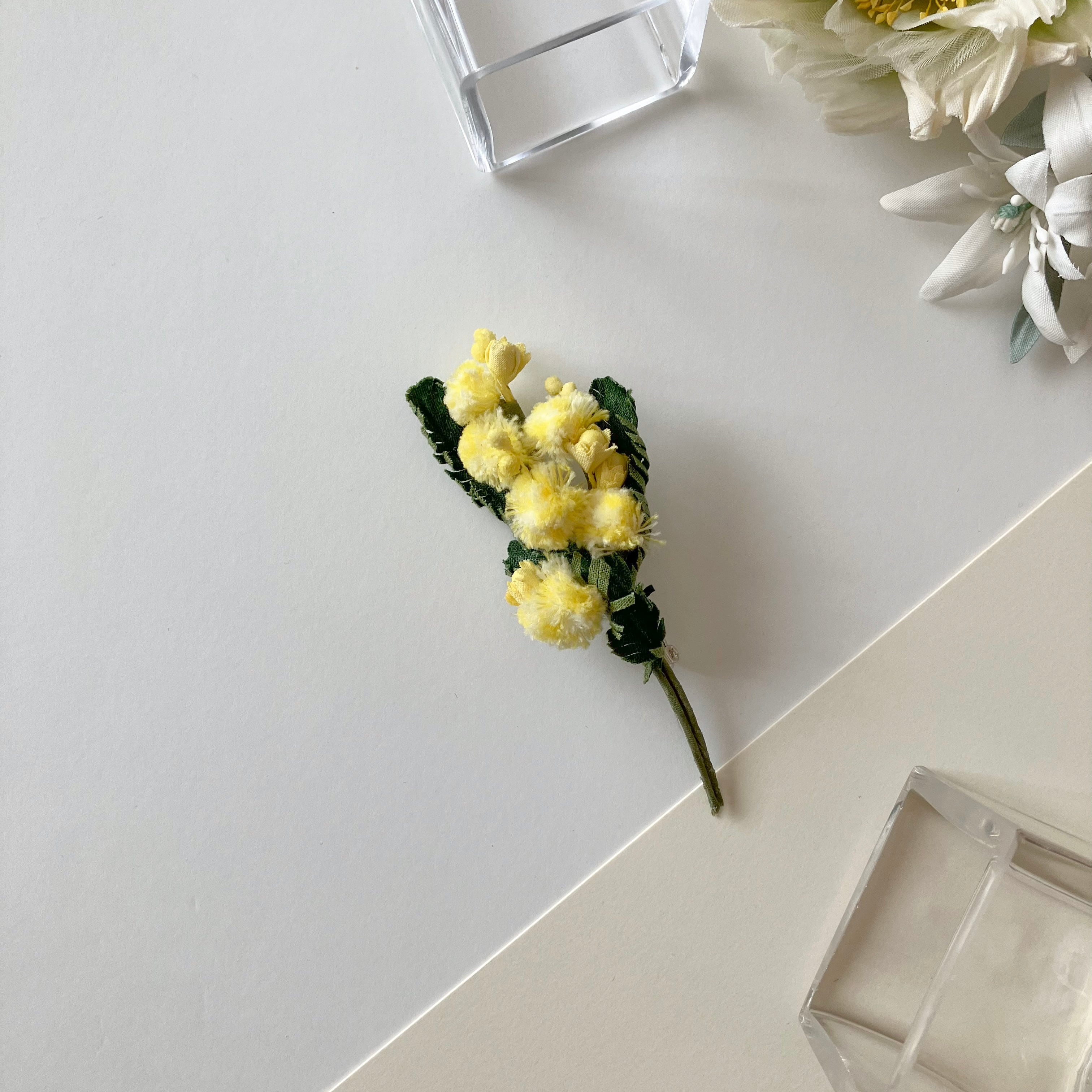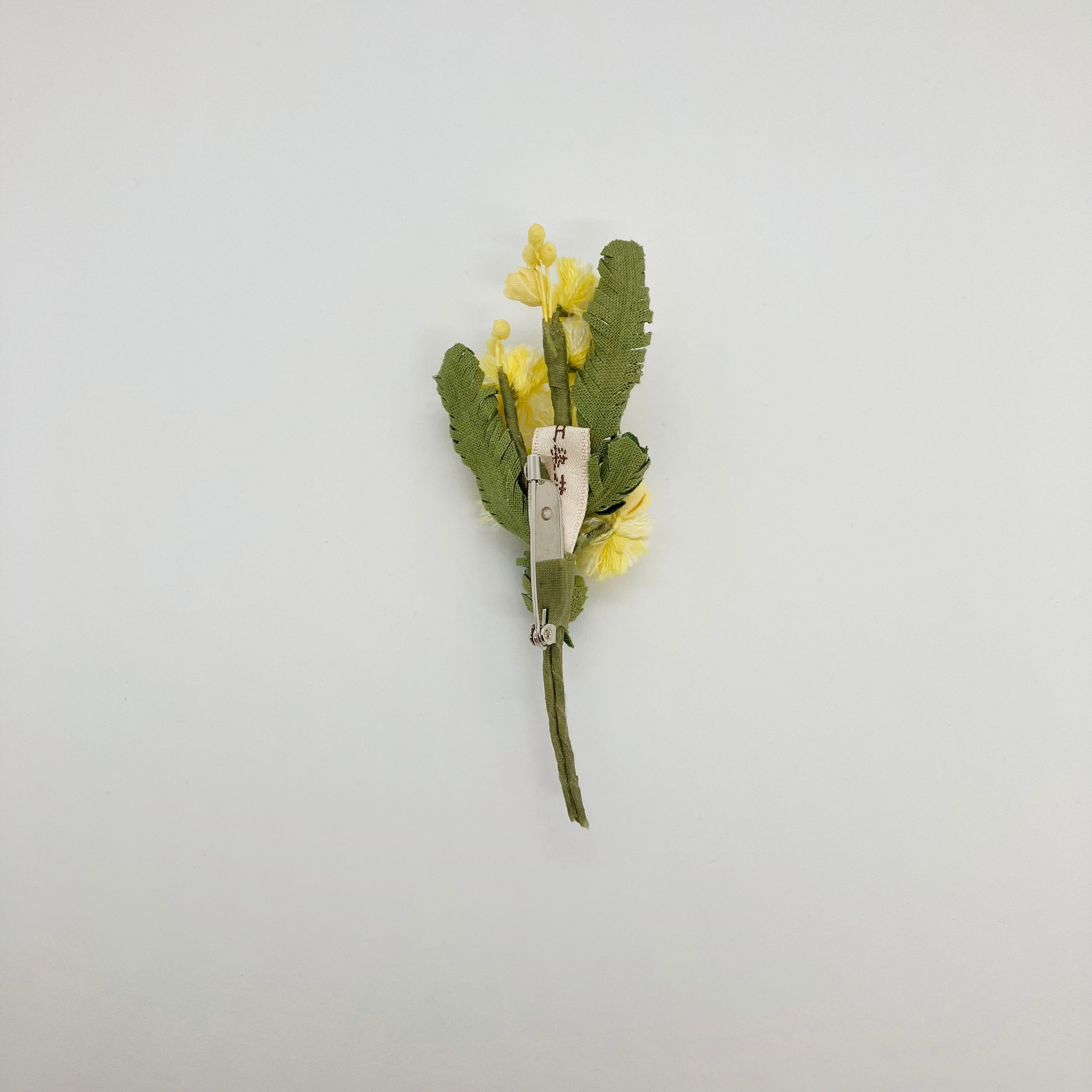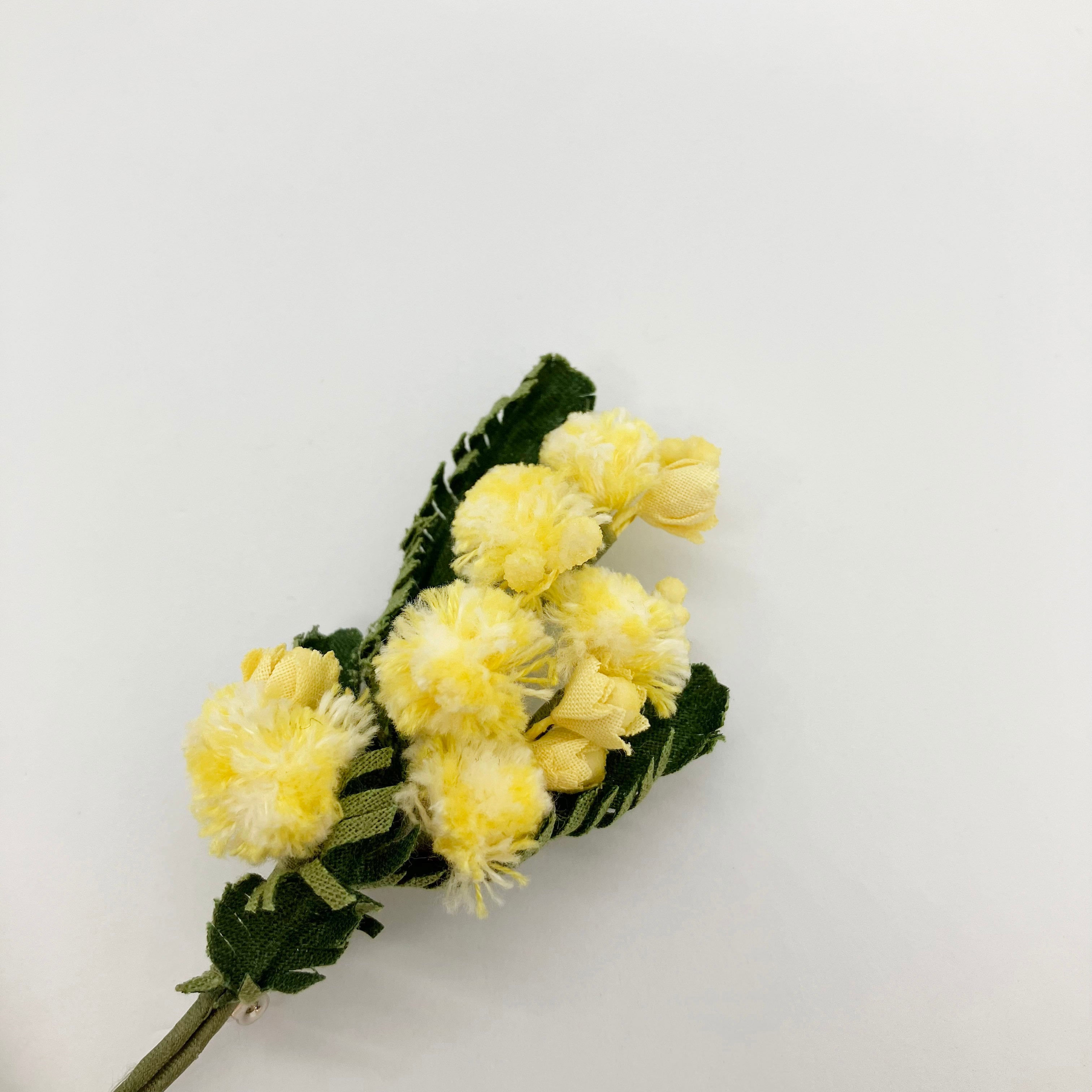 春を彩る満開のミモザのコサージュ。思わず触りたくなるようなふわふわとした花が可愛らしく、装いを一気に春モードに演出。