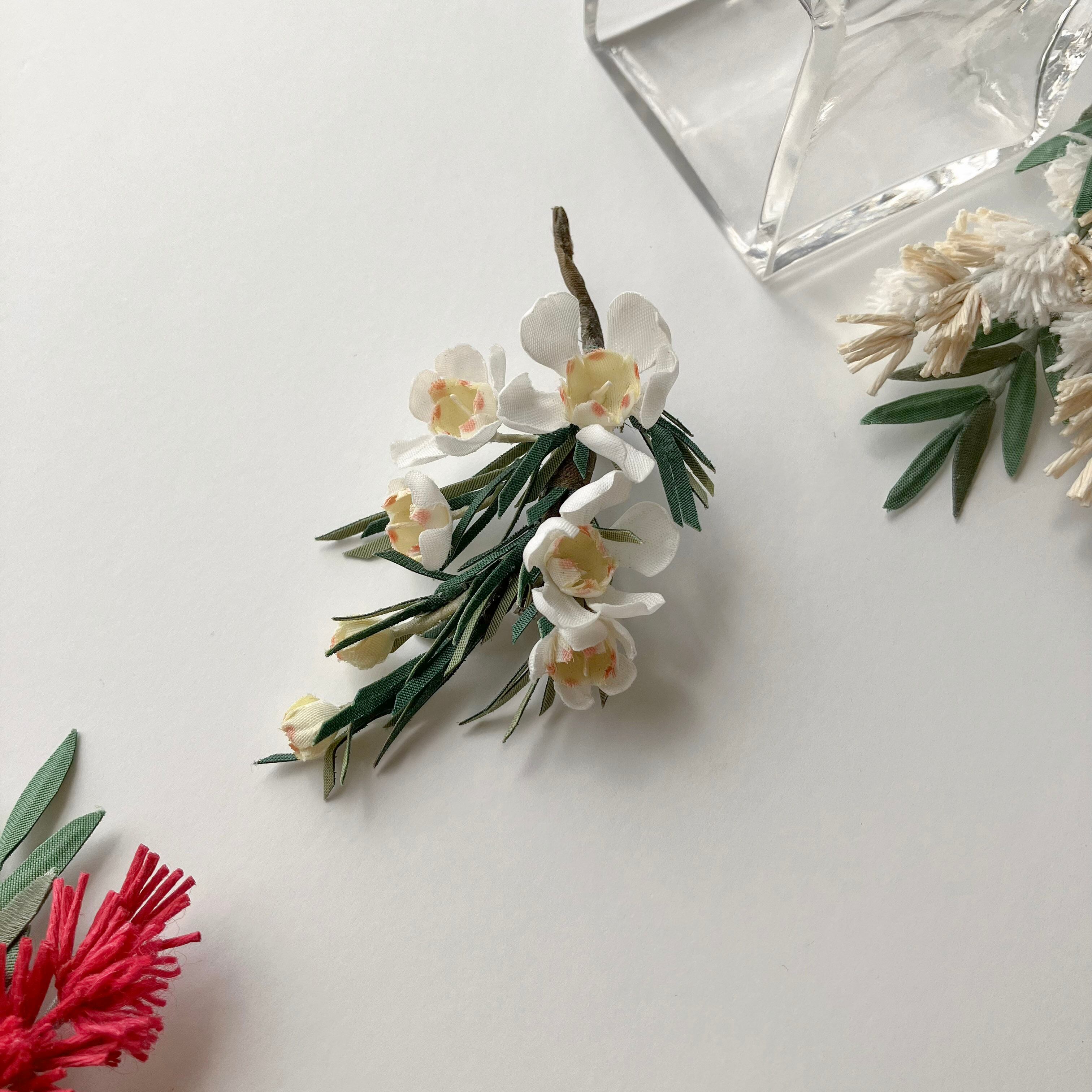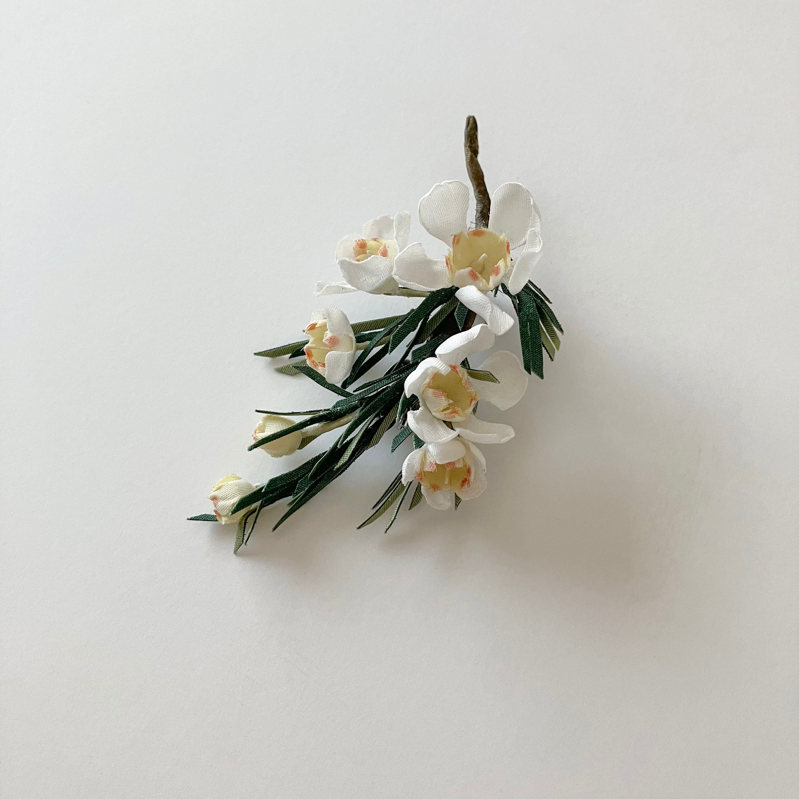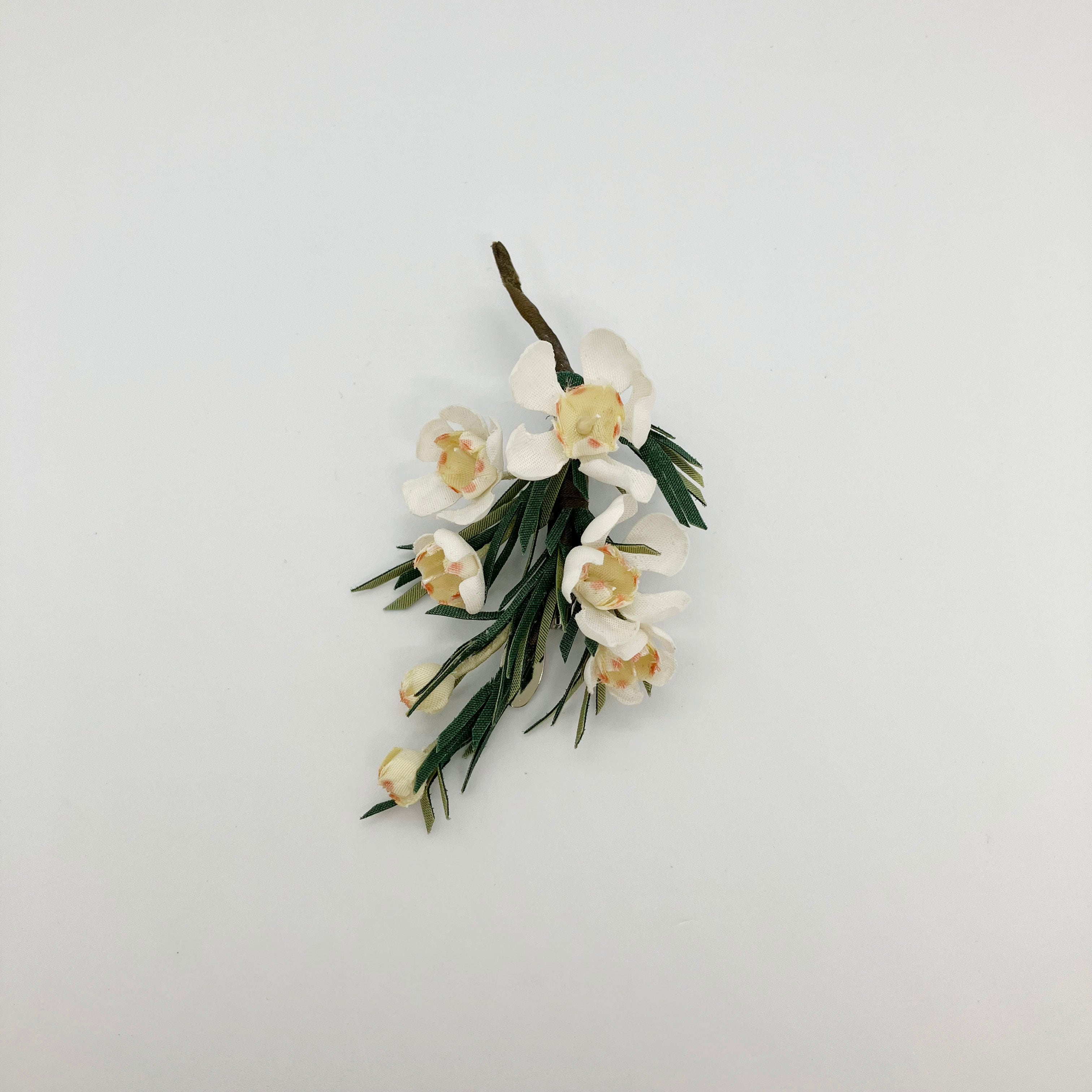 丸いフォルムの愛らしい花とシャープな針葉のバランスが可愛いワックスフラワー。爽やかなグリーンに白い花が映え、シャツやブラウススタイルも涼しげに。