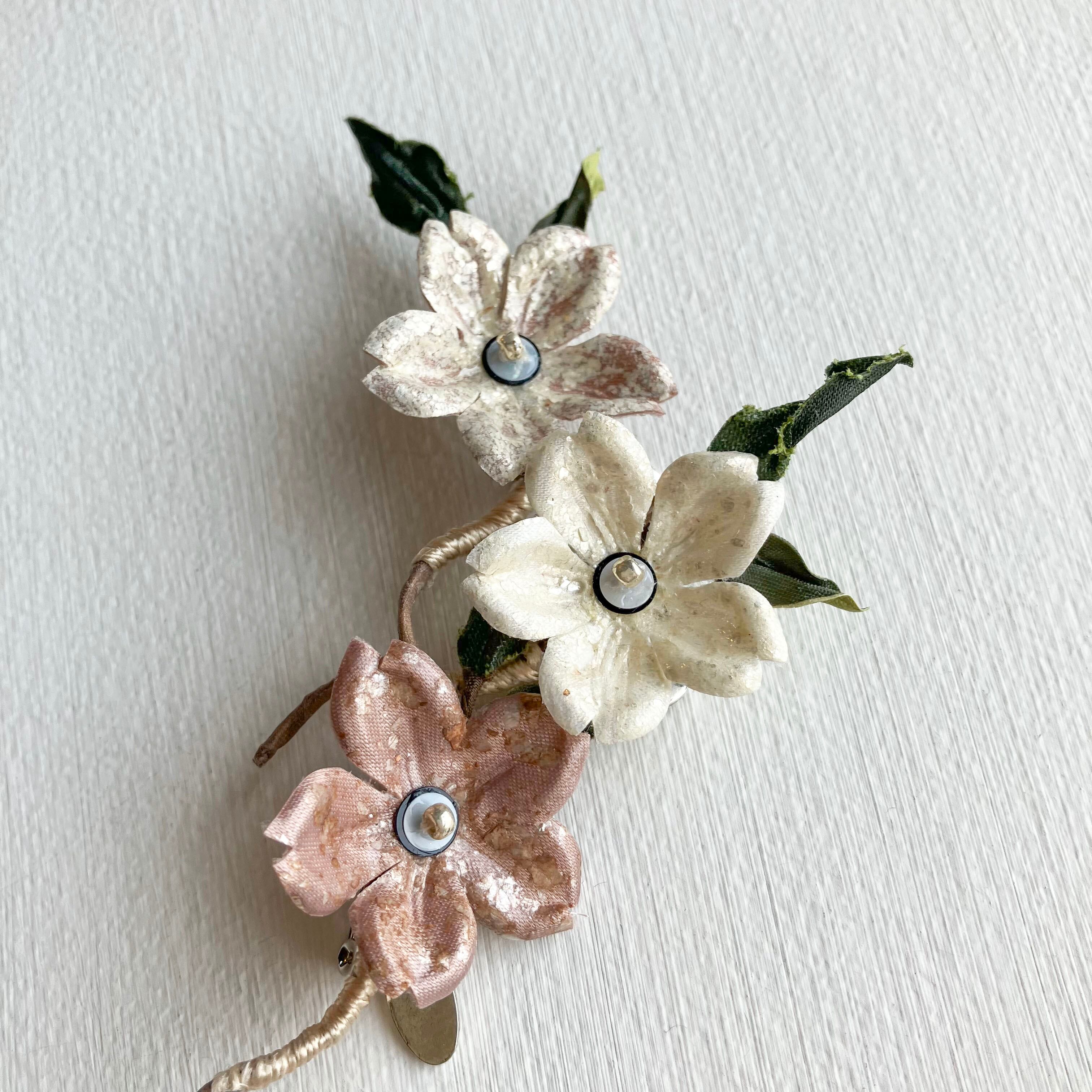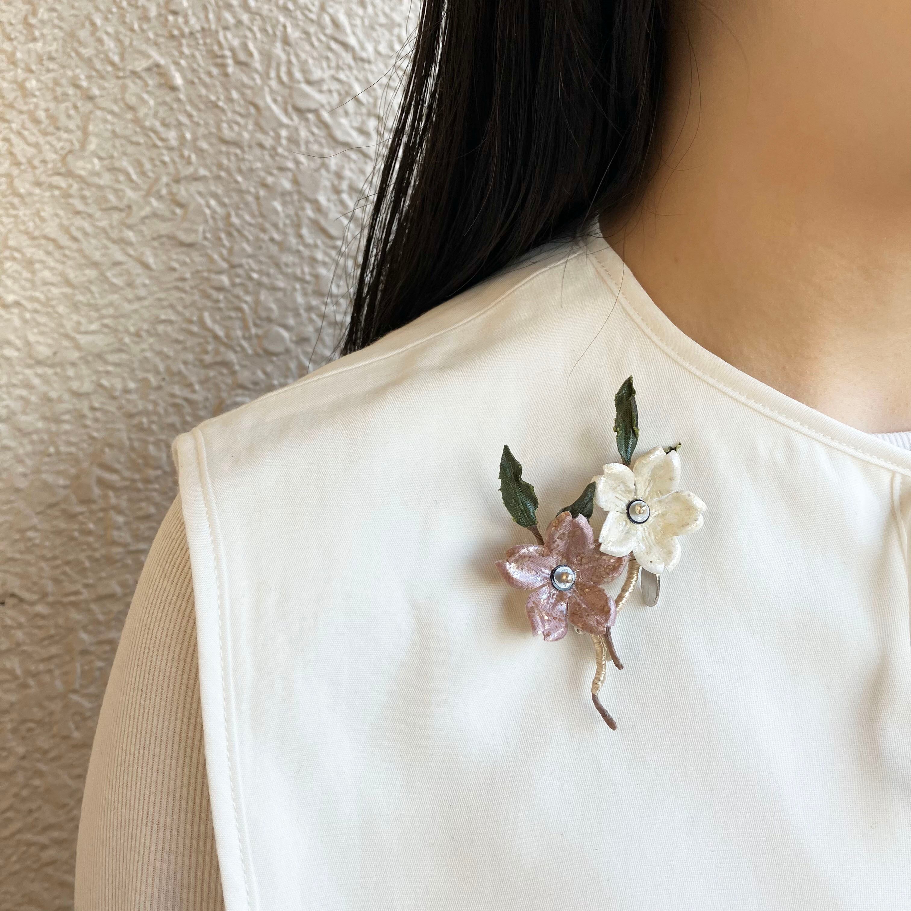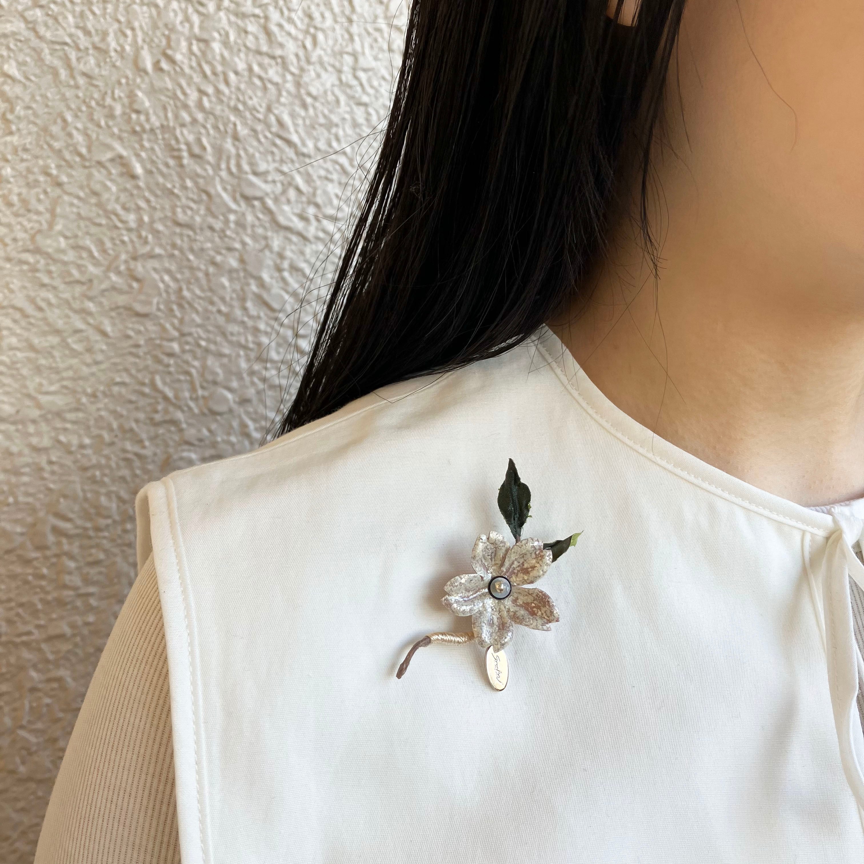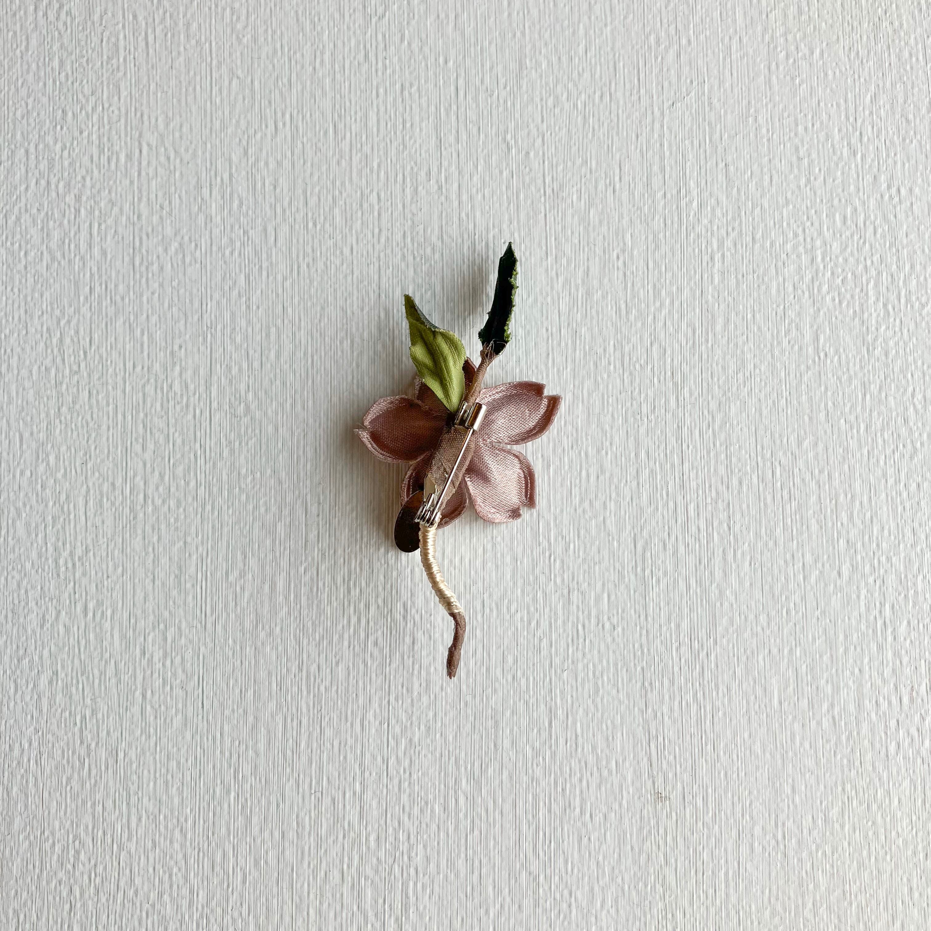 大人っぽさを感じる絶妙なピンクは色にこだわるアトリエ染花ならでは。独自の技術によって雲母がさりげなく輝き、気品あふれる魅力的なブローチに仕上がっています。胸元でキラリと光り、控えめながらも華やかさを演出します。