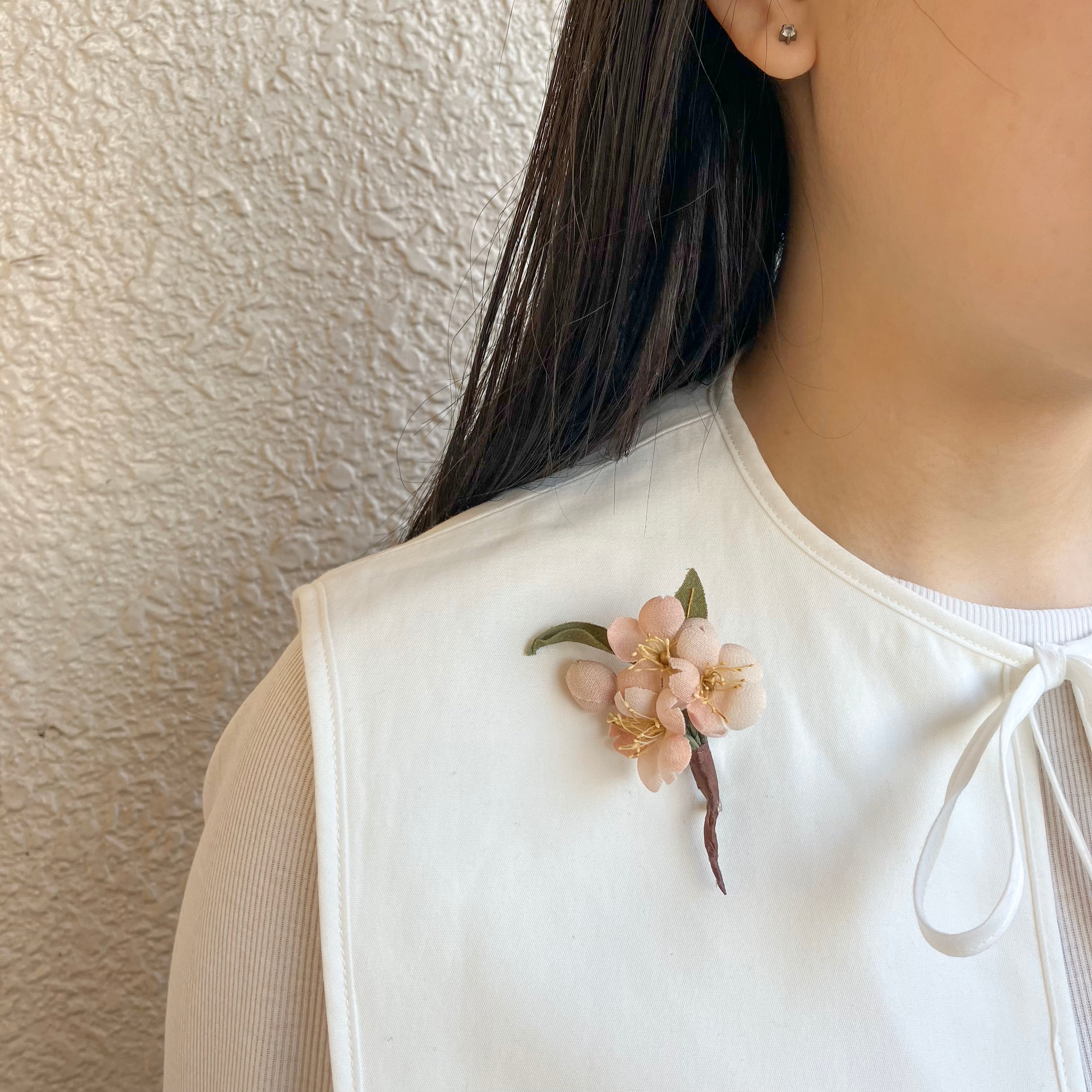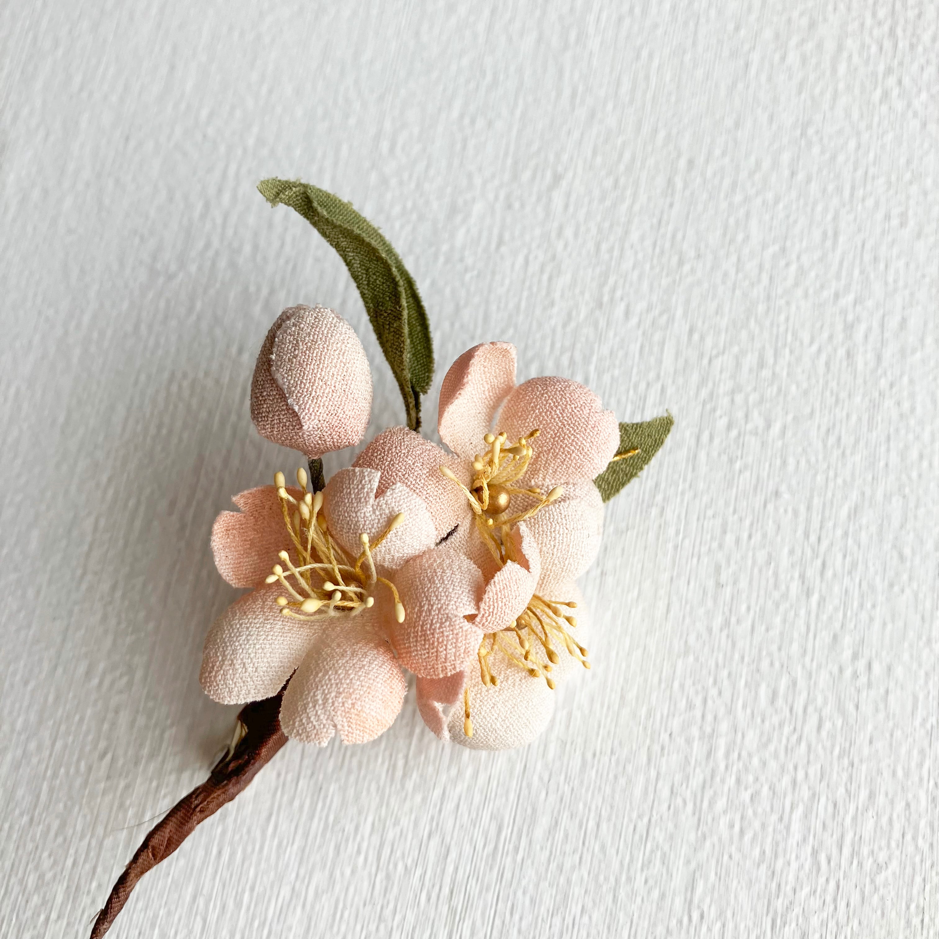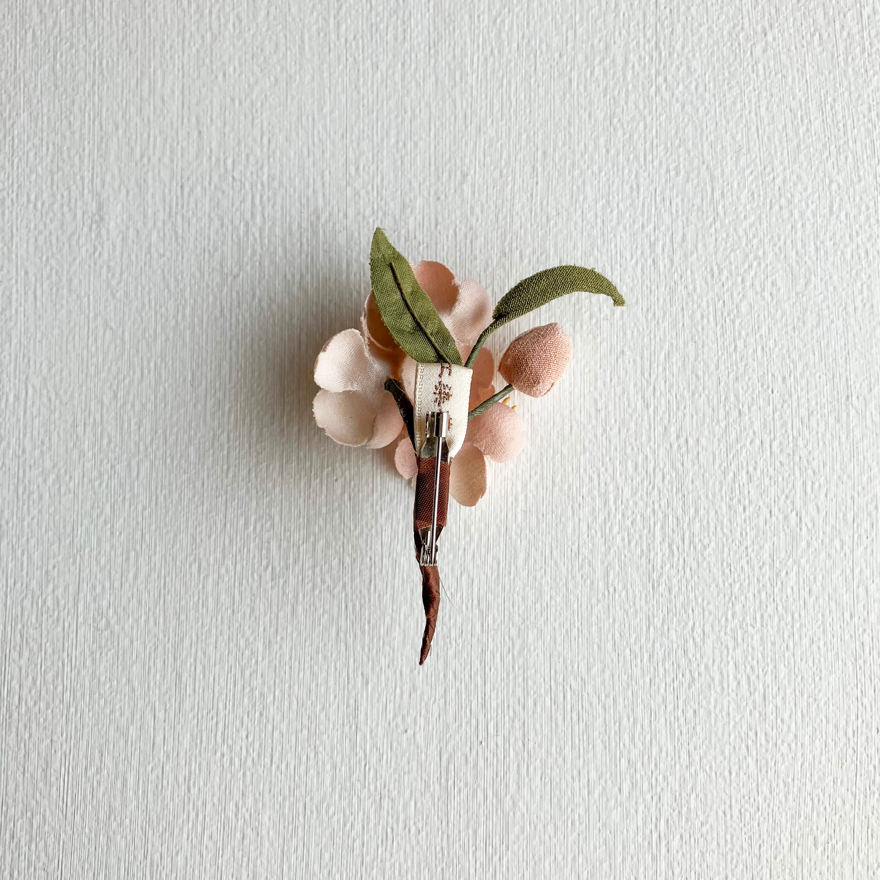 小さな桜がかわいく咲いたミニブローチ。大人っぽいピンクにはほんのりとぼかし染めが入り、葉には金糸で控えめな輝きが。上品で奥ゆかしい日本の美を落とし込みました。